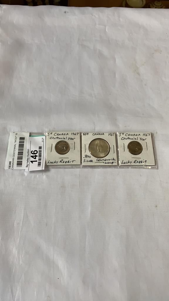 1967 CANADIAN CENTENNIAL "WOLF" 50 CENT .800 SILVER AND 2 RABBIT NICKELS