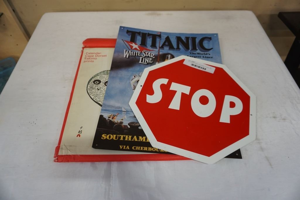 1971 ESKIMO PRINT CALENDER, TITANIC TIN SIGN, STOP SIGN