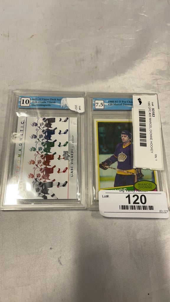 1980 OPC #20 MARCEL DIONNE HOCKEY CARD GRADED 7.5 AND 2021 UPPER DECK SERIES 1 #EM-2 GABE VILARDI ELECTROMAGNETIC CARD GRADED 10
