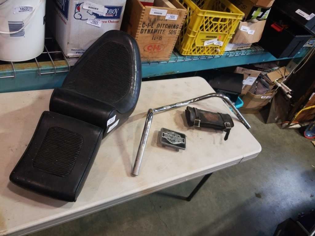 1984 Harley softtail seat, handle bars, emblem and tool pouch