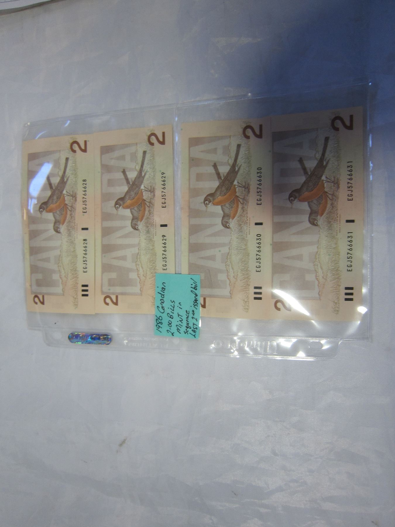 1986 4 CANADIAN $2 BILLS MINT IN SEQUENCE LAST ISSUE OF CANADIAN $2 BILL