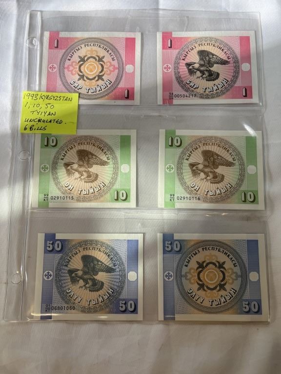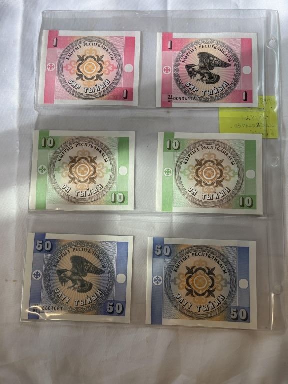 1993 KYREYZSTAN 1, 10, 50 TYIYAN UNCIRCULATED 6 BILLS
