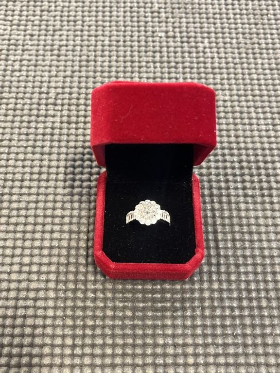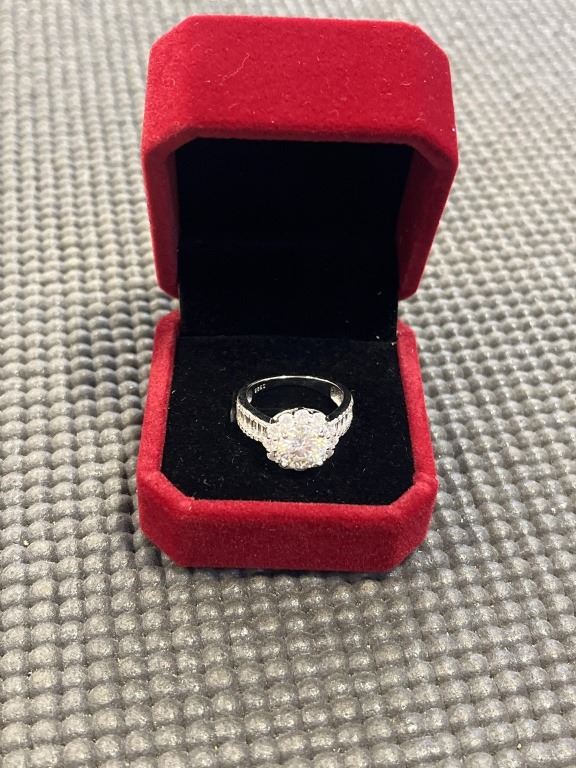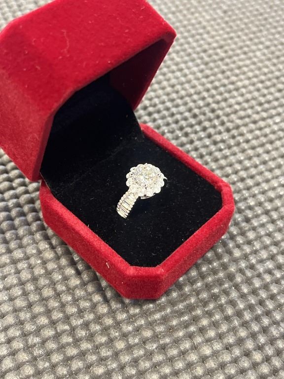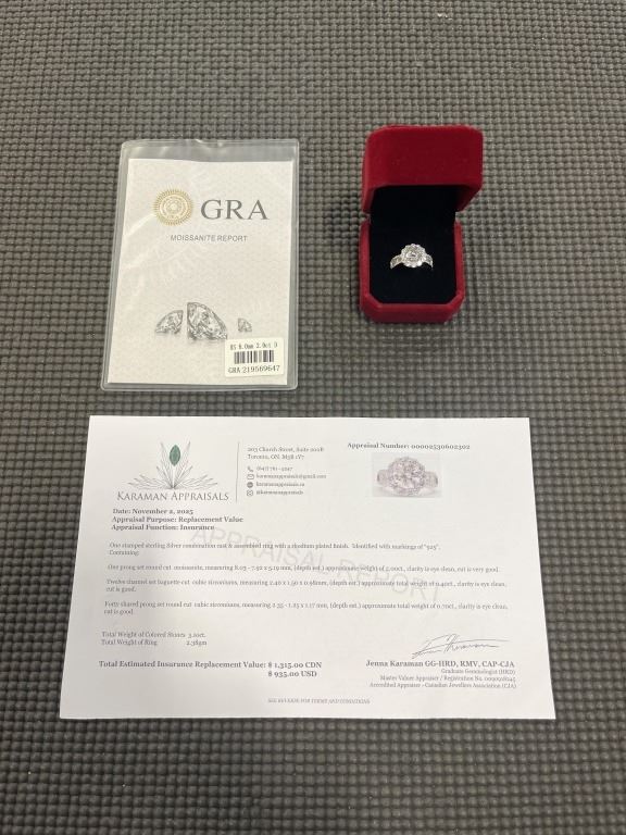 2.00 CT GRA CERTIFIED ROUND BRILLIANT CUT MOISSANITE STONE VVS D COLOR WITH 12 CHANNEL SET BAGUETTE CUBIC ZIRCONIA WITH 40 ROUND BRILLIANT CUT CUBIC ZIRCONIA SET IN HALO AND IN DUAL LINES PER SHANK SET IN 925 SILVER RING SIZE 6 RETAIL VALUE $1,315.00