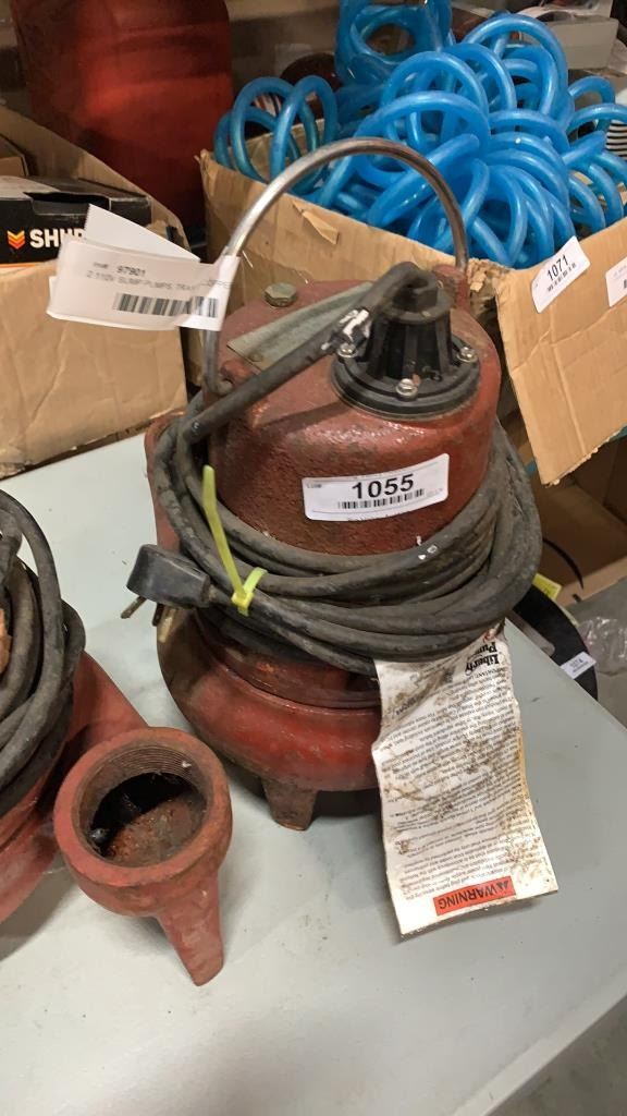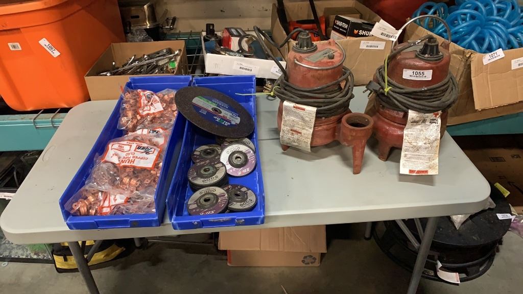 2 110V SUMP PUMPS, TRAY OF COPPER PIPE STRAPS AND TRAY OF GRINDING DISCS