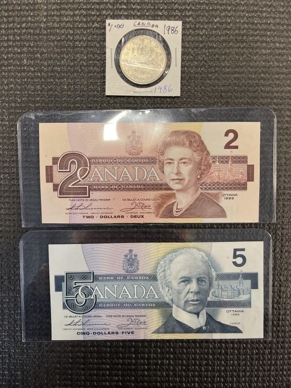 2 1986 CANADIAN BILLS AND COIN, $1 COIN PLUS MINT $2 AND $5 BILL