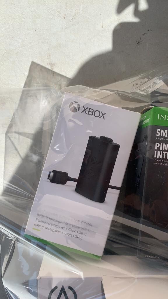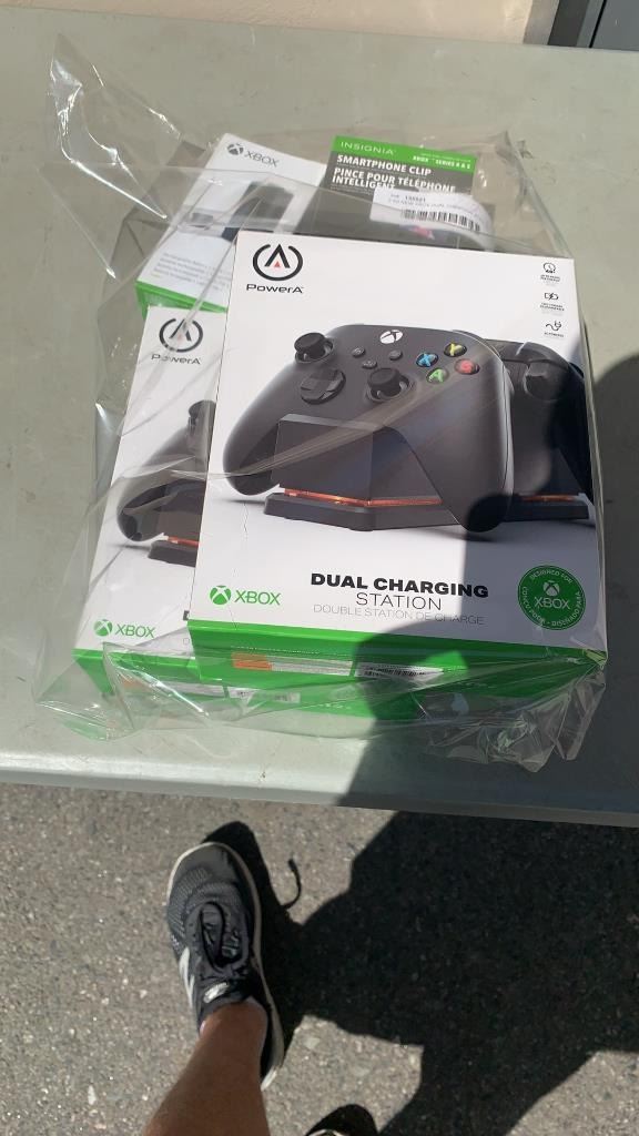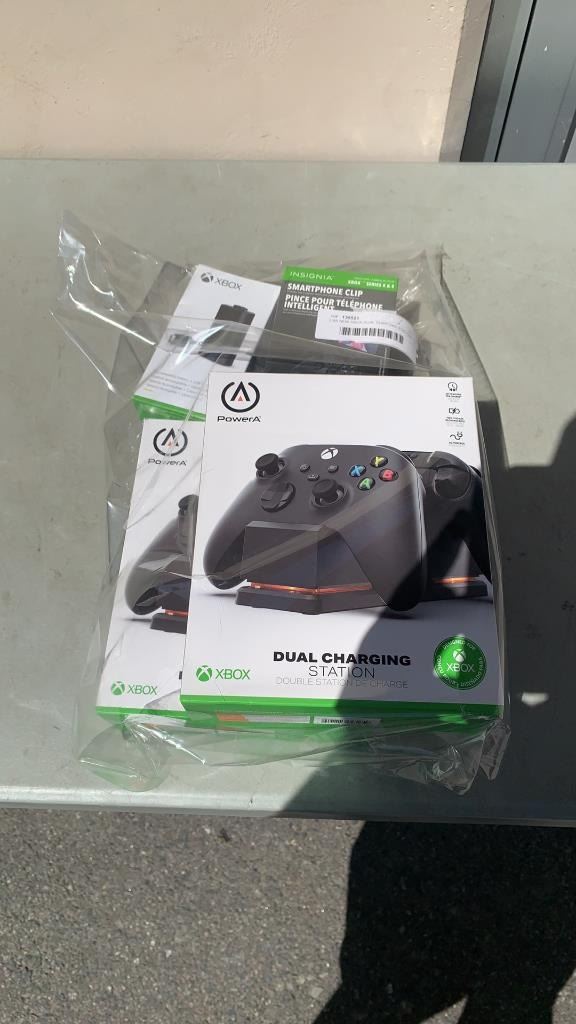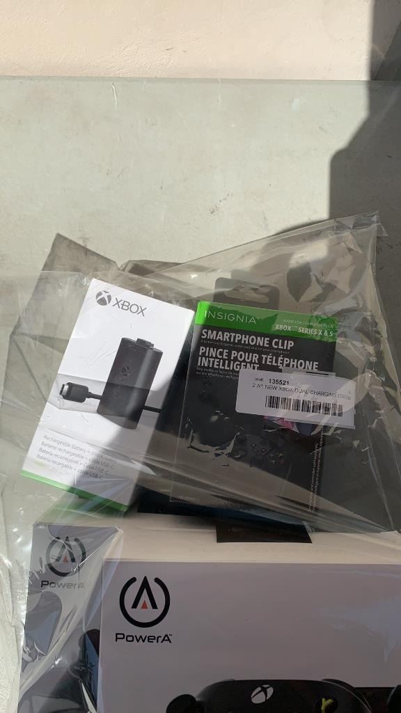 2 AS NEW XBOX DUAL CHARGING STATIONS WITH RECHARGABLE BATTERY PACK, CHAT HEADSET, AND SMARTPHONE CLI