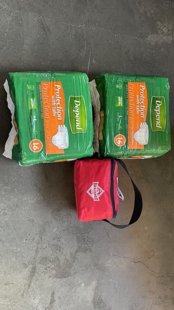 2 BAGS OF DEPENDS ABSORBANT UNDERWEAR AND EMERGENCY KIT