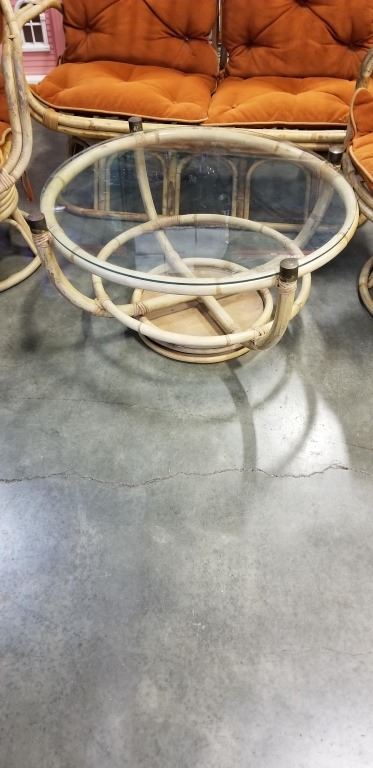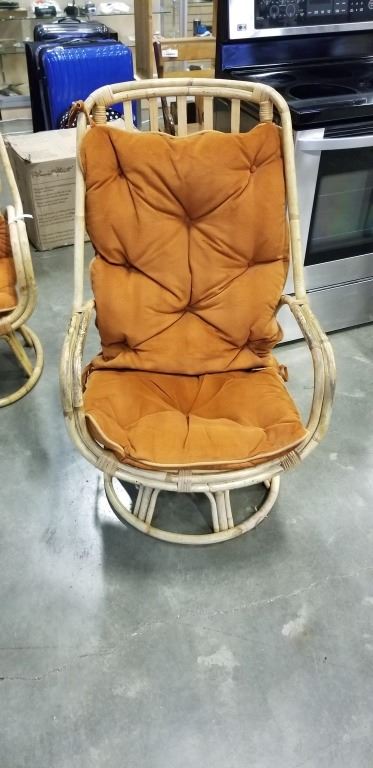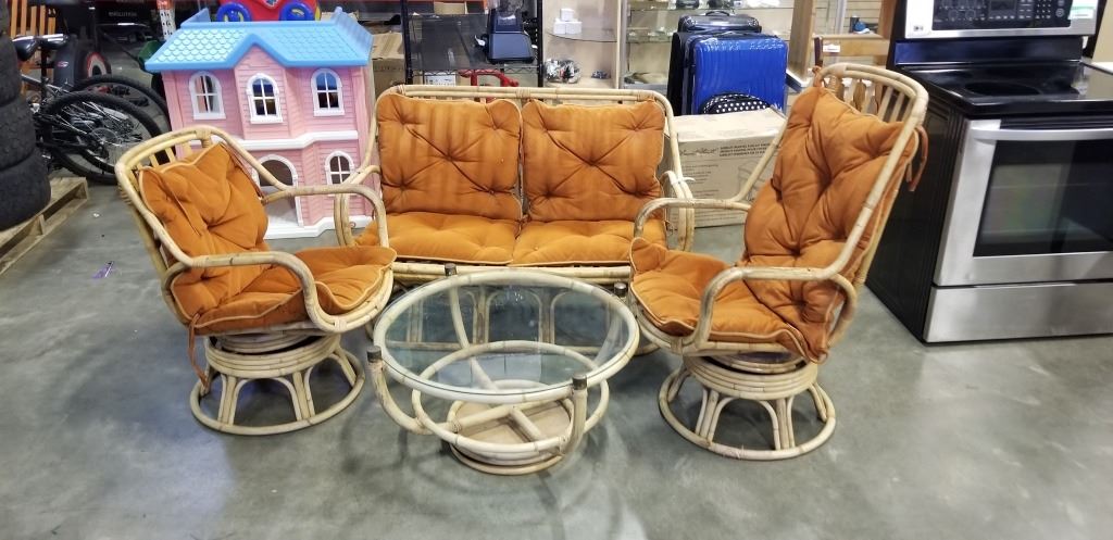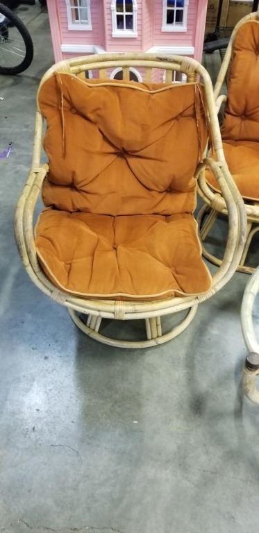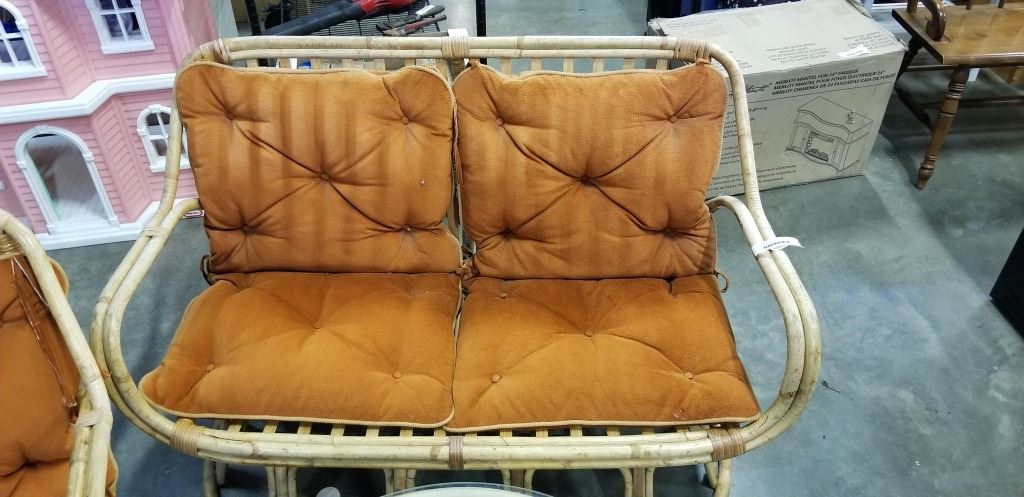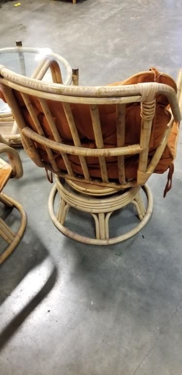 2 BAMBOO SWIVEL CHAIRS AND LOVE SEAT W/ CUSHIONS