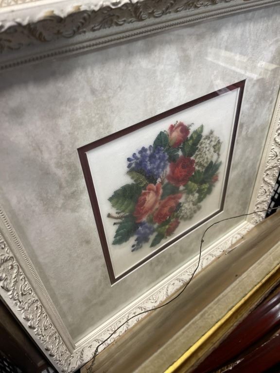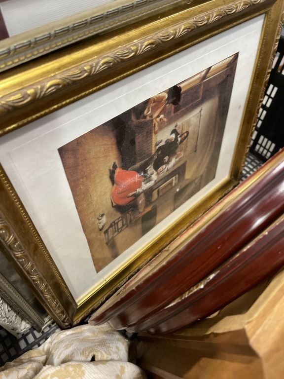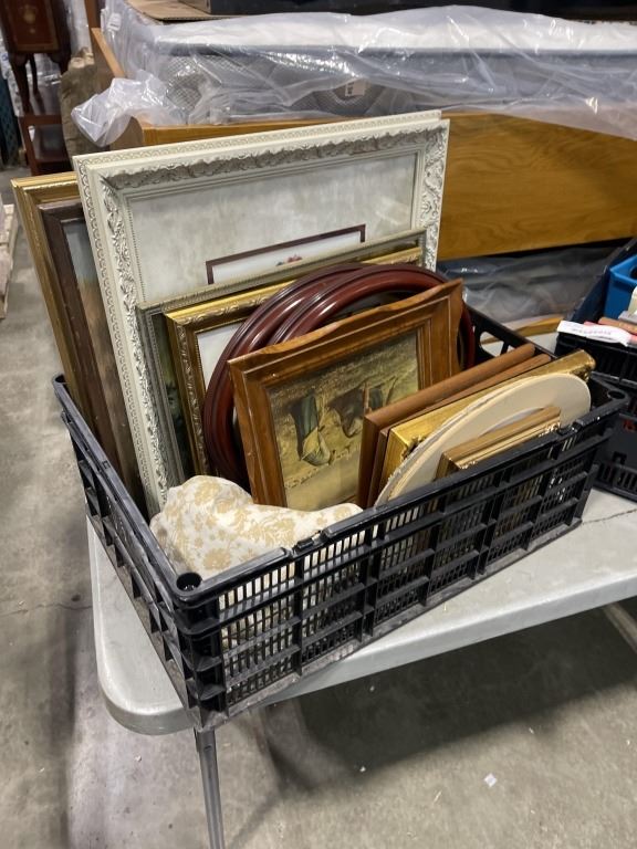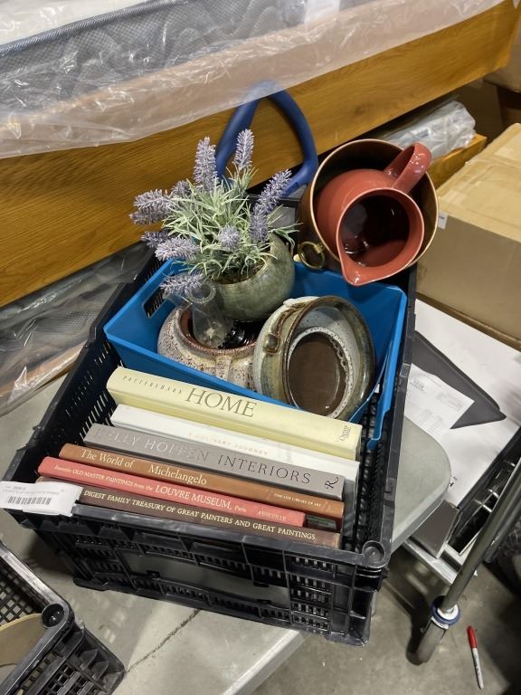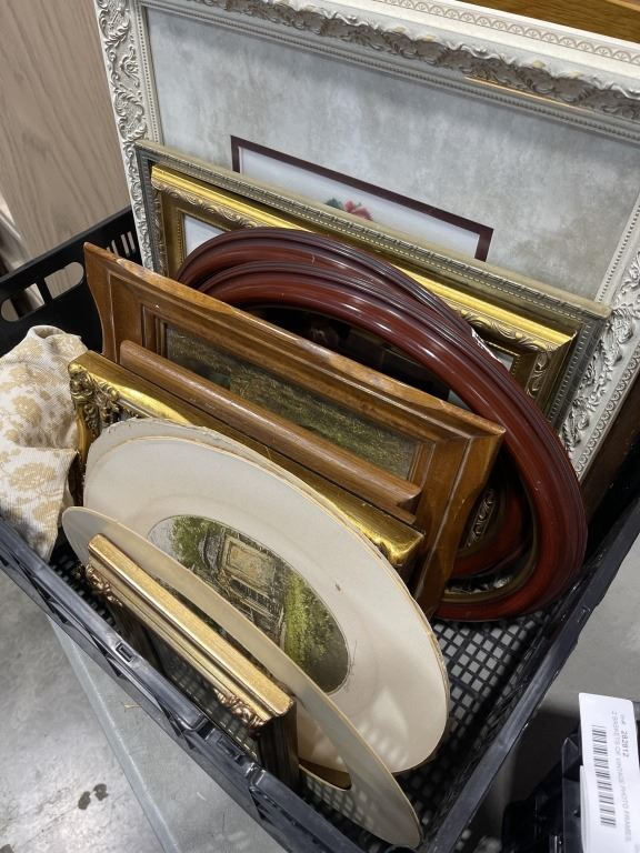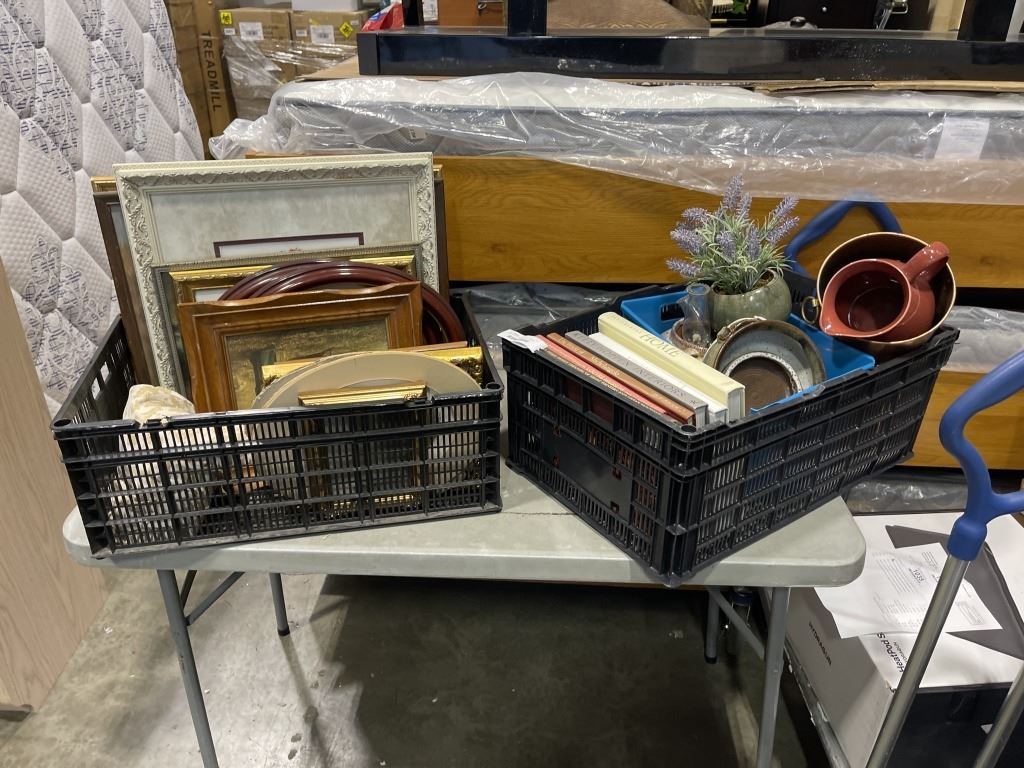 2 BASKETS OF VINTAGE PHOTO FRAMES, COFFEE TABLE BOOKS, POTTERY, ETC