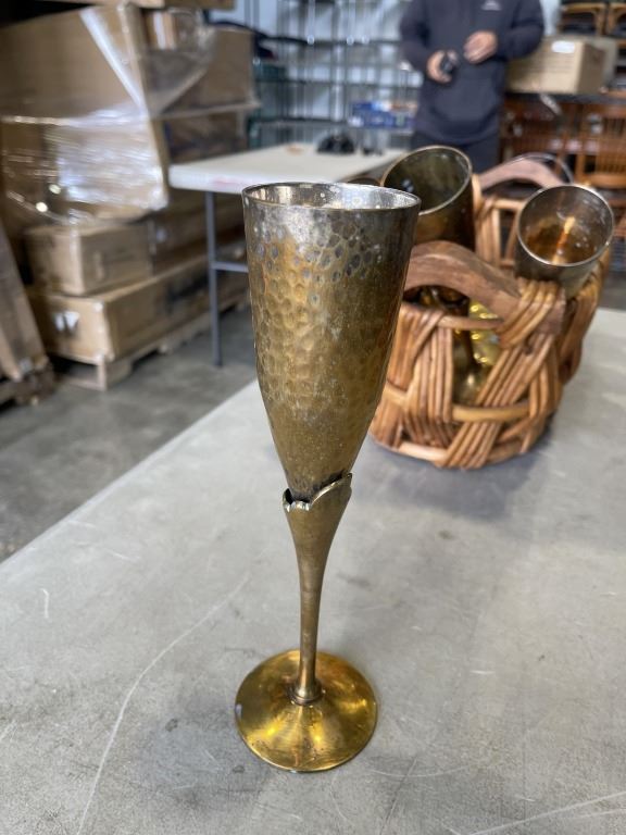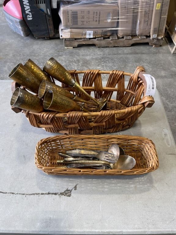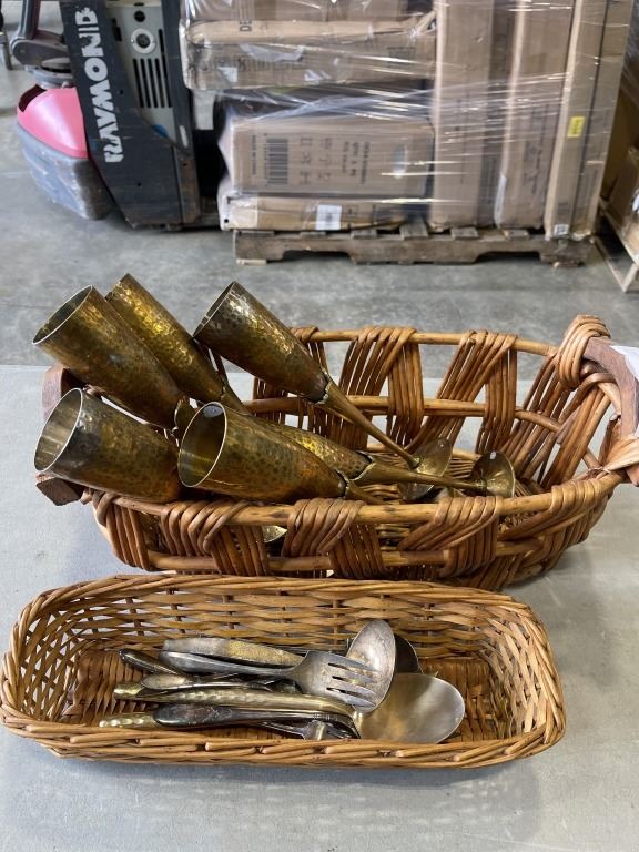2 BASKETS WITH VINTAGE CUTLERY AND BRASS GOBLETS