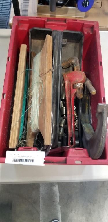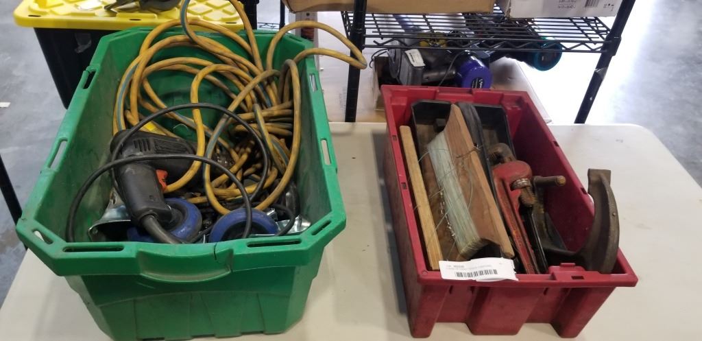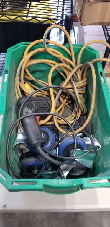 2 BINS OF HAND TOOLS, CASTORS, EXTENSION CORDS, ETC