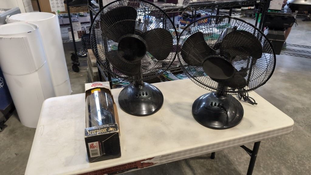 2 BLACK 16 INCH TABLE FANS AND DIRT DEVIL SCORPION CAR VAC