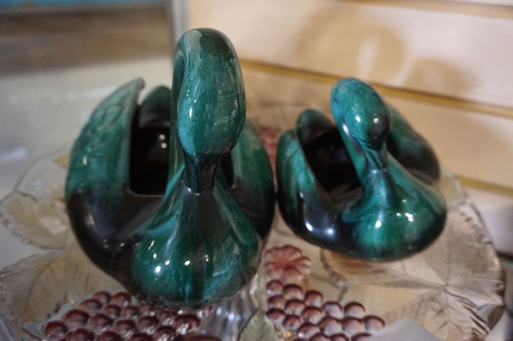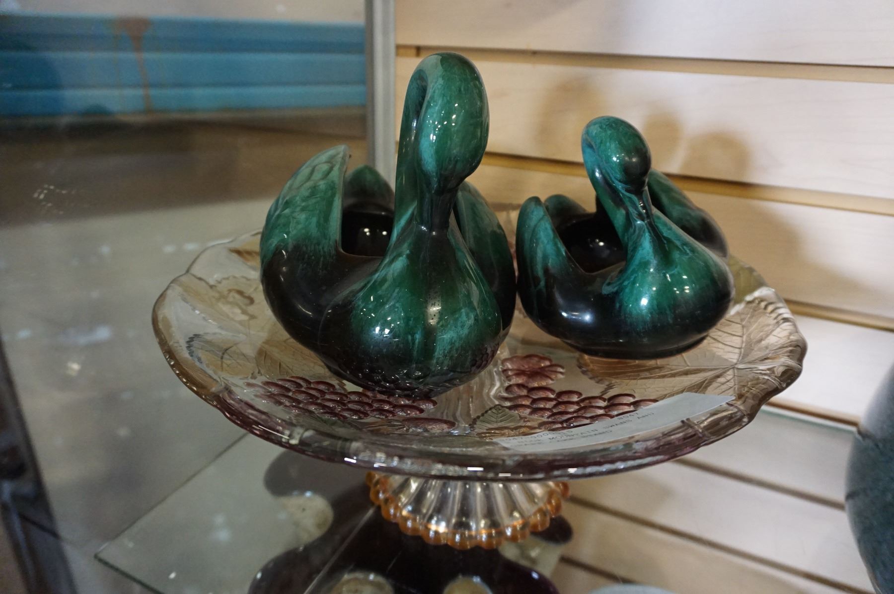 2 BLUE MOUNTAIN SWANS AND GRAPE CAKE STAND