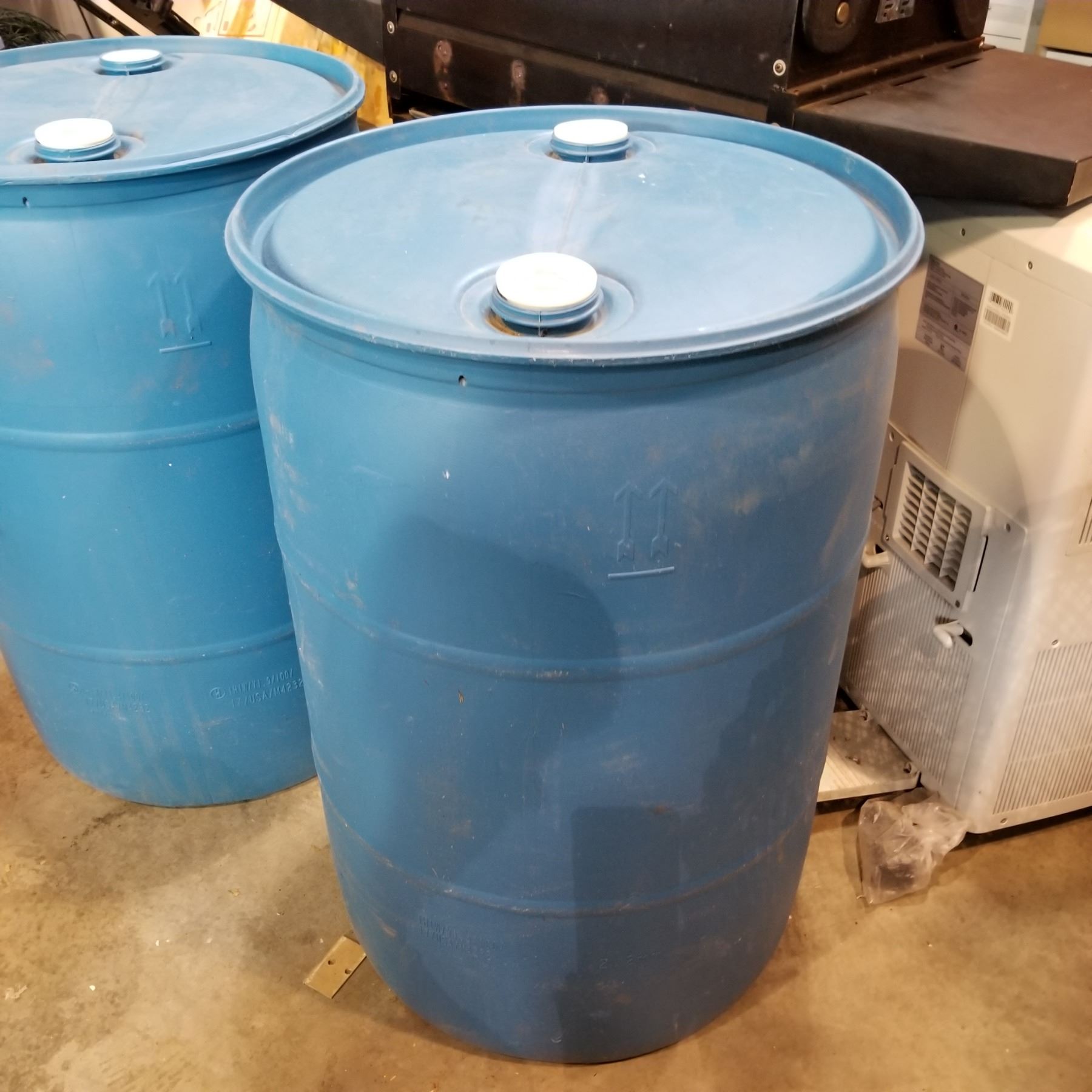 2 BLUE PLASTIC BARRELS
