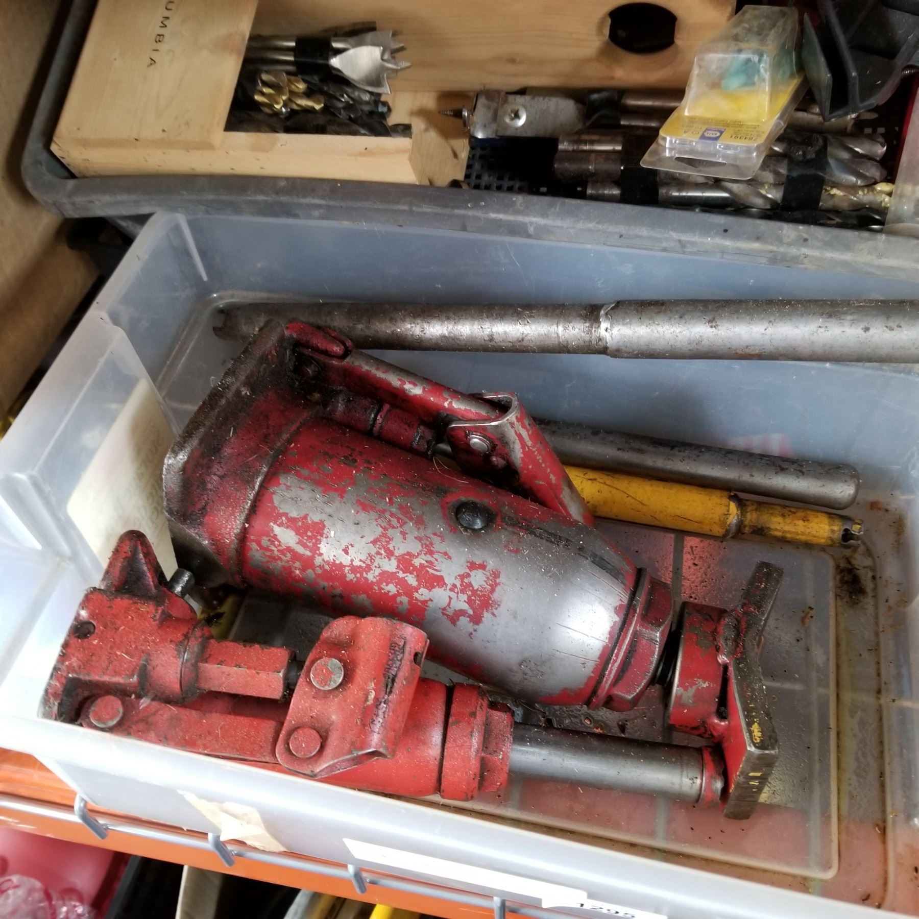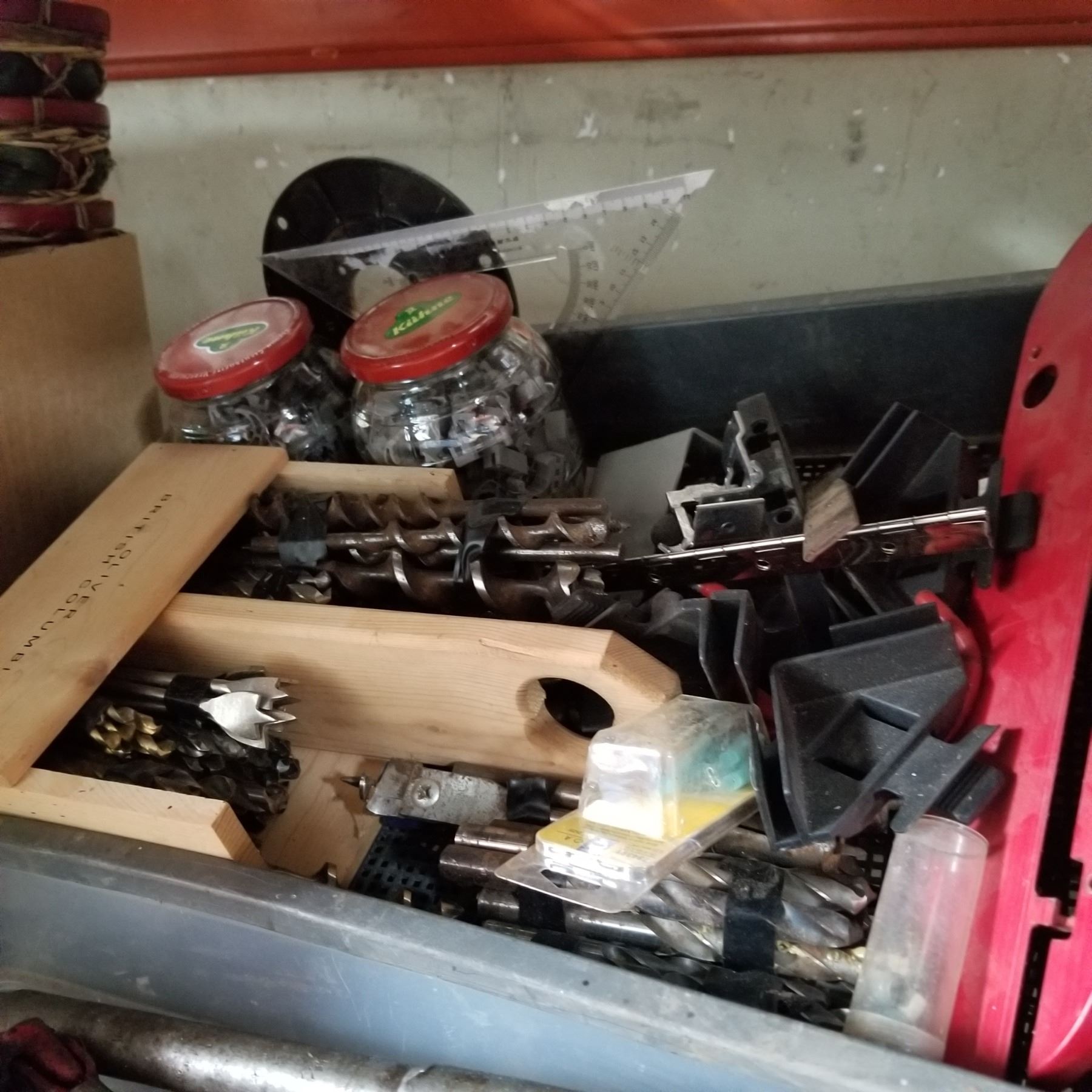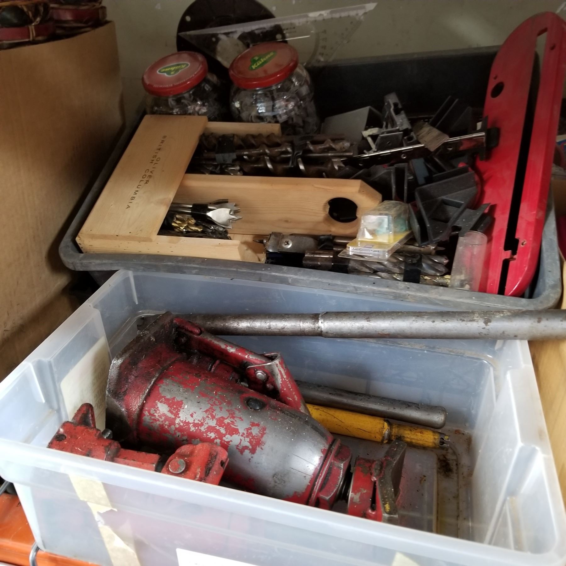 2 BOTTLE JACKS, TRAY OF HARDWARE, AND DRILL BITS