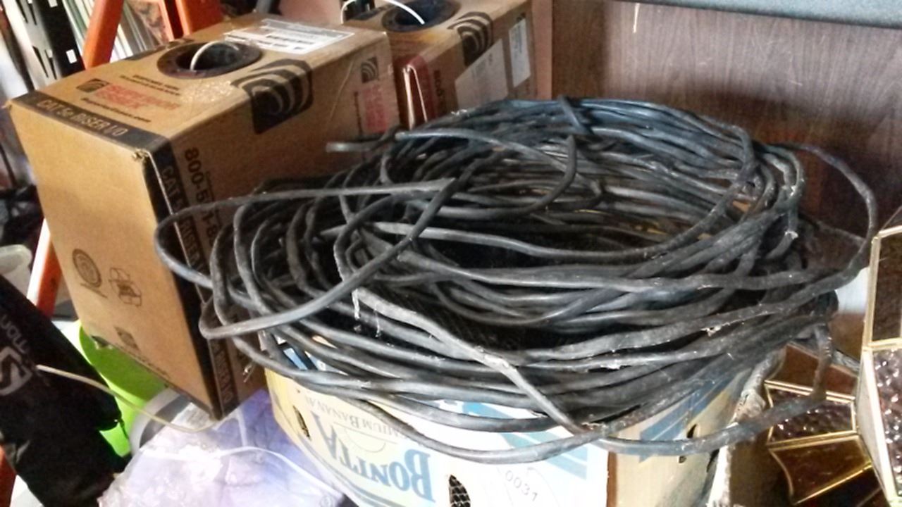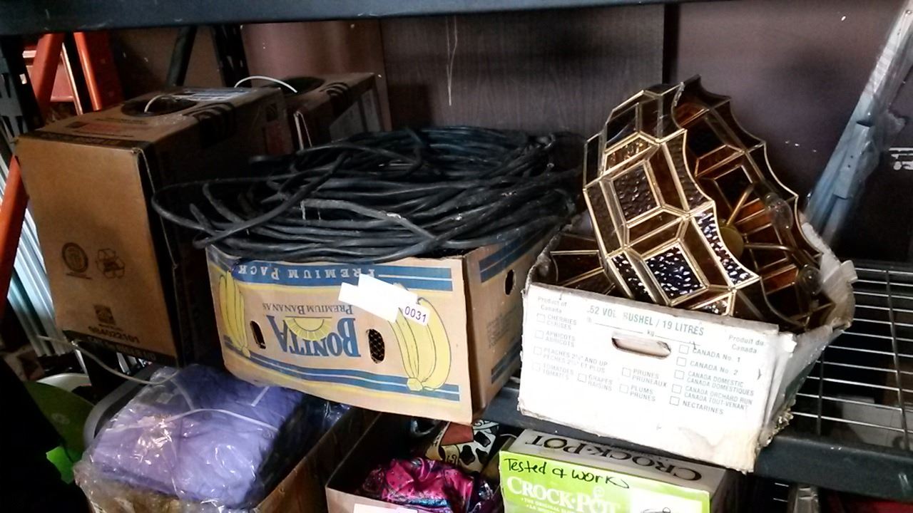 2 BOXES ELECTRICAL CABLE, GUTTER PROTECTOR, AND CABLE AND COLOURED GLASS CHANDELIER