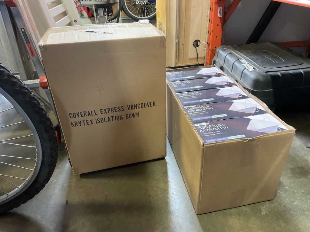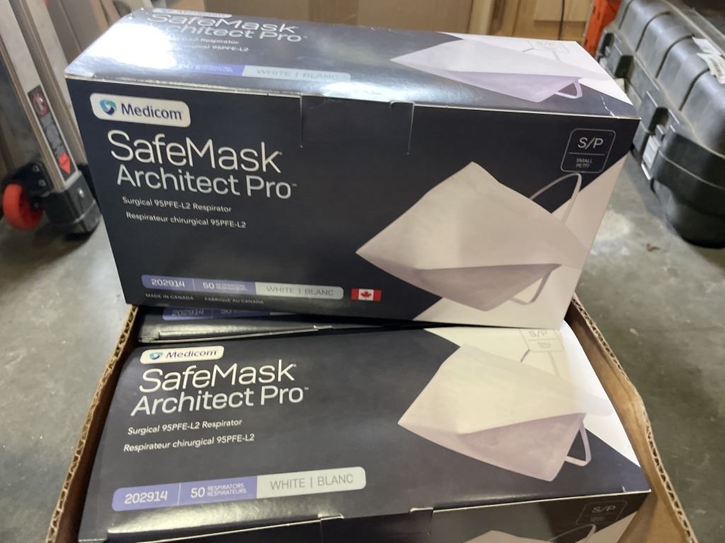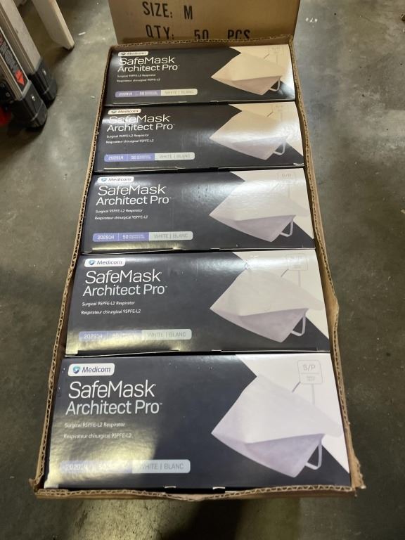 2 BOXES OF 500 SAFEMASK DISPOSABLE MASKS AND BOX OF 50 COVERALL DISPOSABLE PROTECTIVE GOWNS