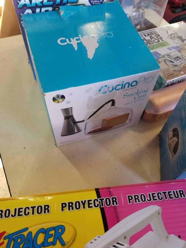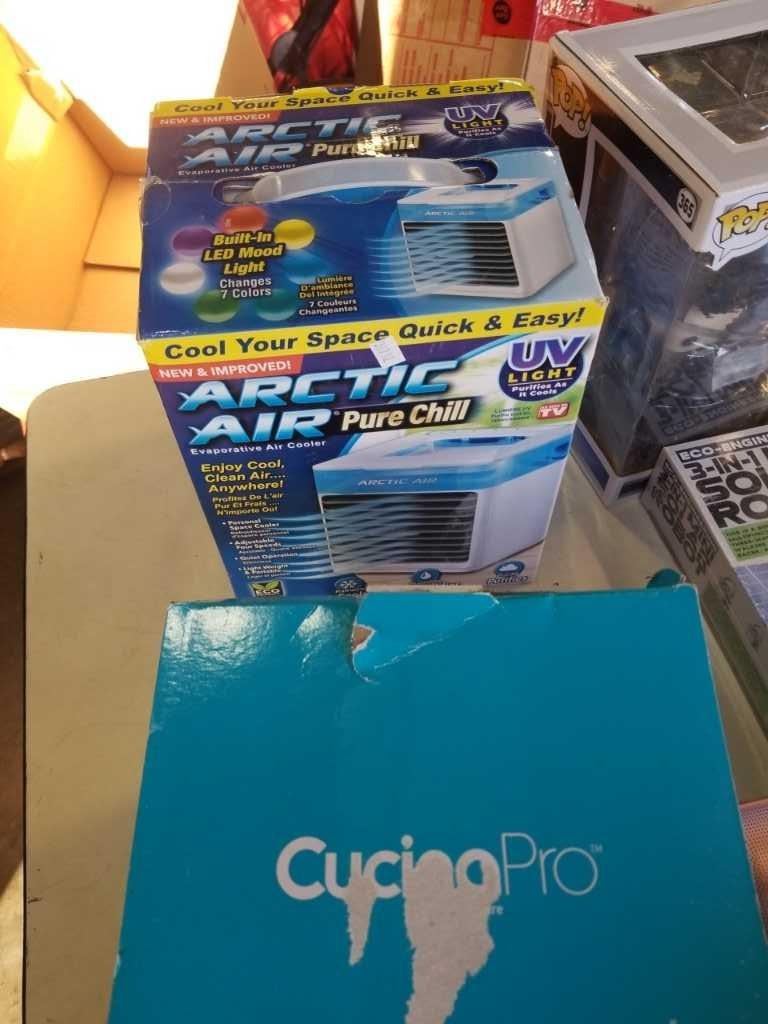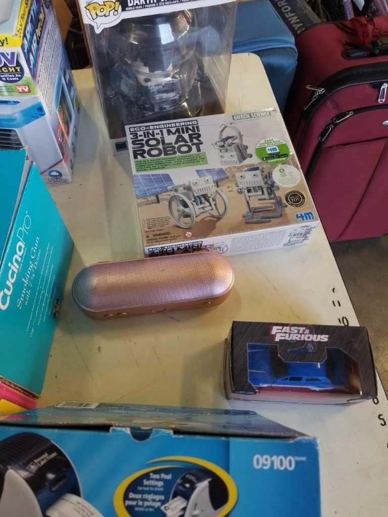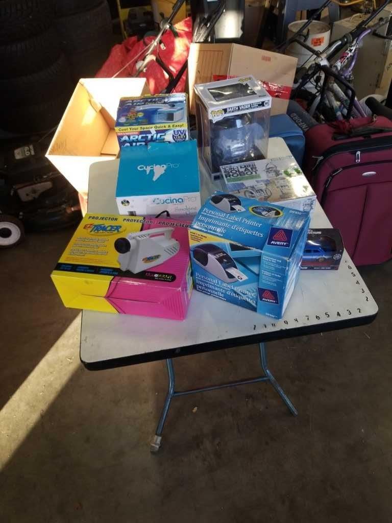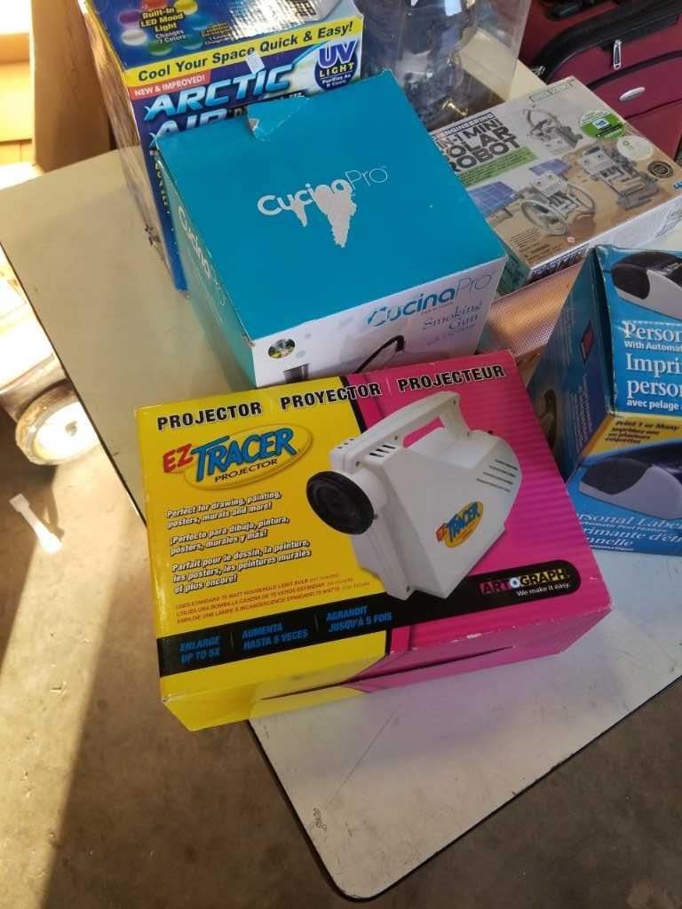 2 BOXES OF AS NEW AND OTHER OLD STOCK ITEMS, EZ TRACER PROJECTOR, LABEL MAKER, DARTH VADER TOY, ETC