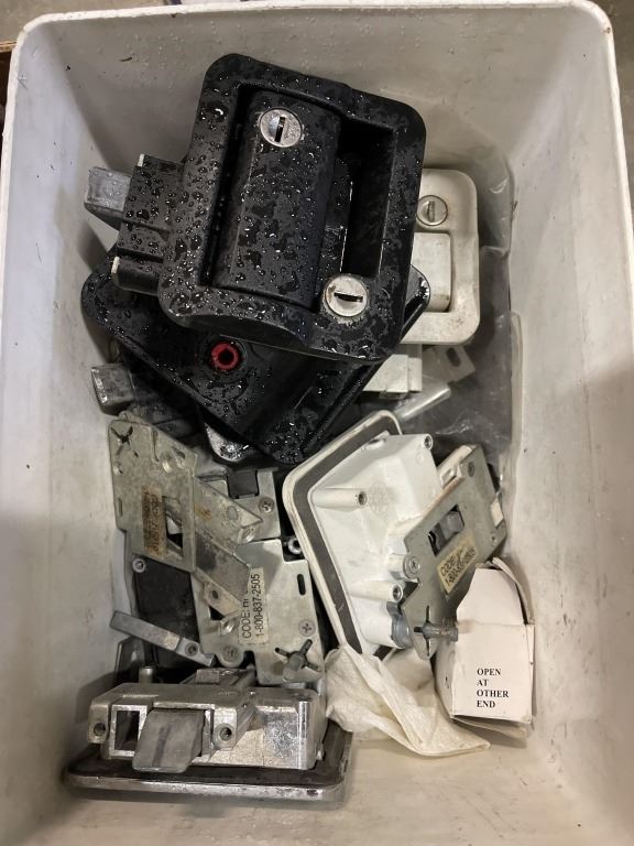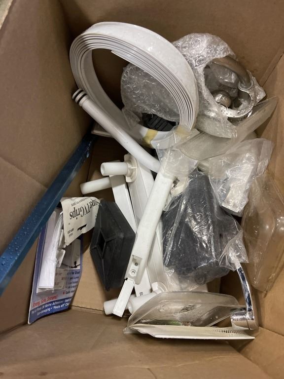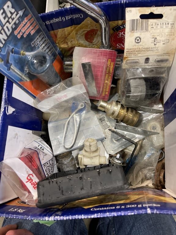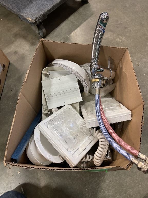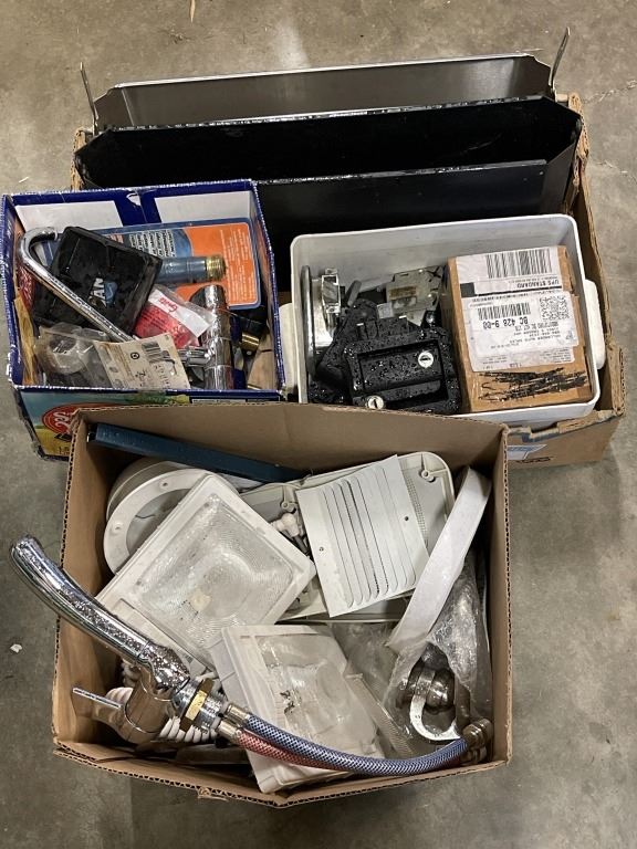 2 BOXES OF ASSORTED RV PARTS AND HARDWARE, LIGHTS TAPS ETC