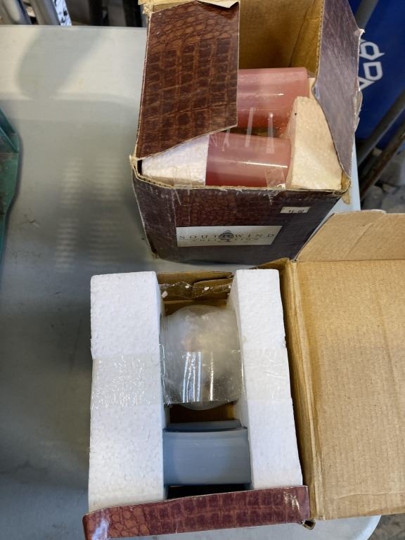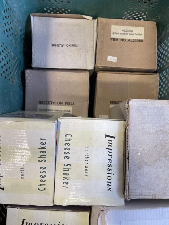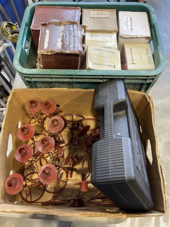2 BOXES OF CANDLE HOLDERS, WINE BOTTLE HOLDERS, CHEESE SHAKERS, ETC