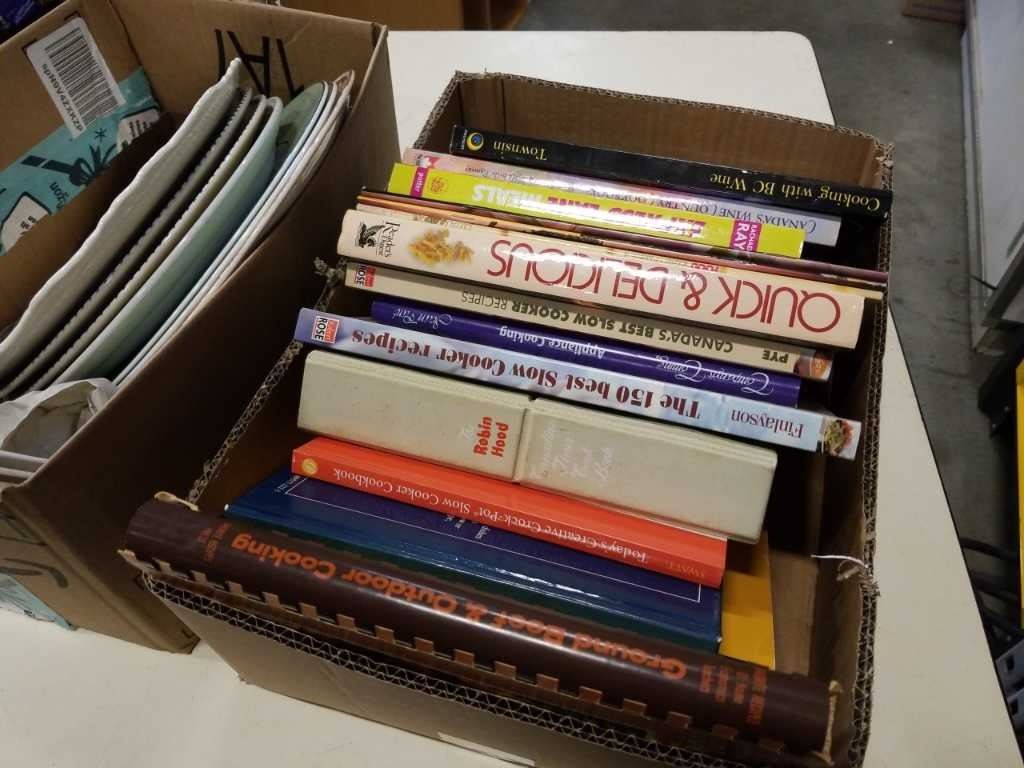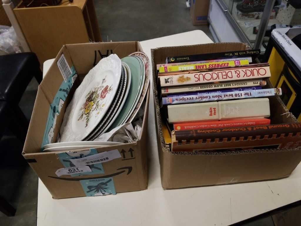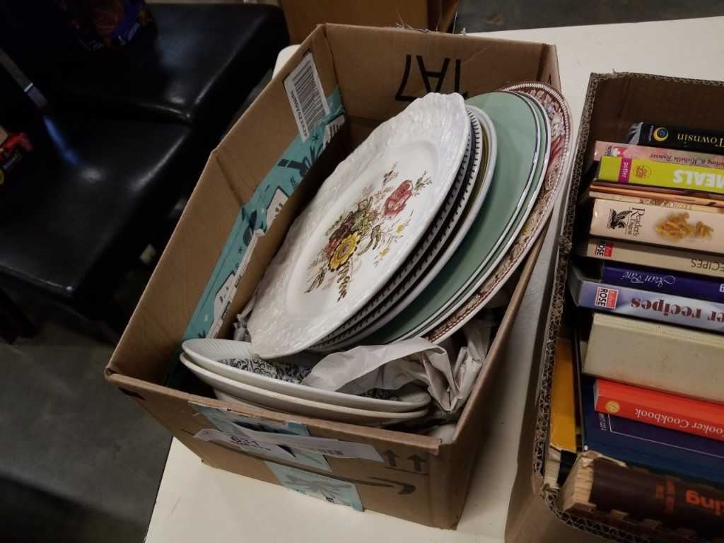 2 BOXES OF CHINA PLATES AND COOKBOOKS