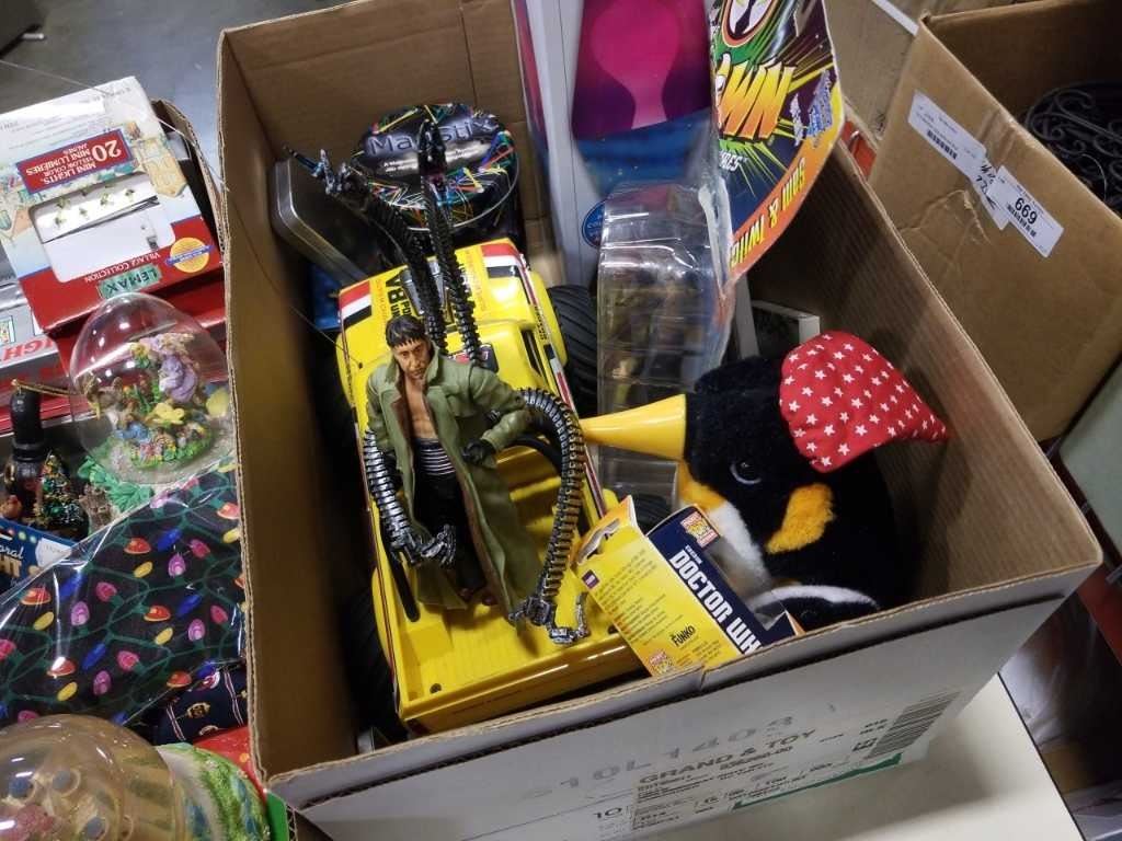 2 BOXES OF CHRISTMAS DECOR AND TOYS
