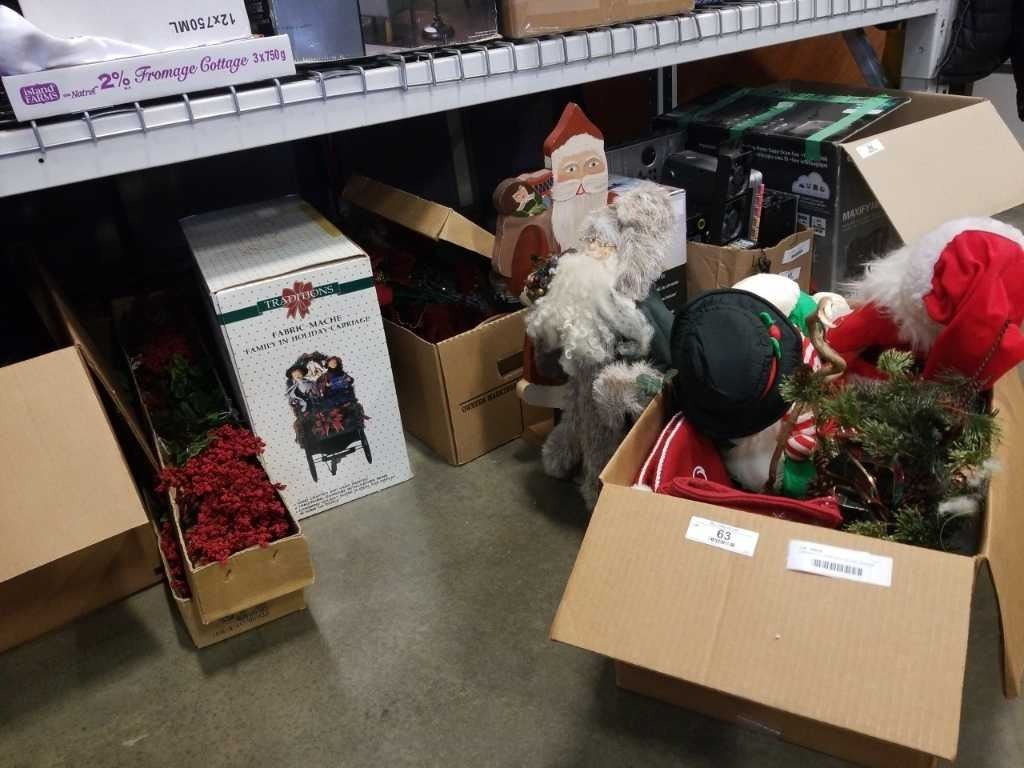 2 BOXES OF CHRISTMAS DECOR, SANTAS AND FAMILY HOLIDAY CARRIAGE