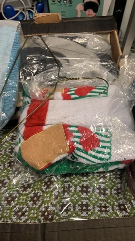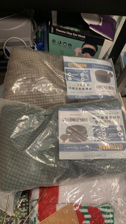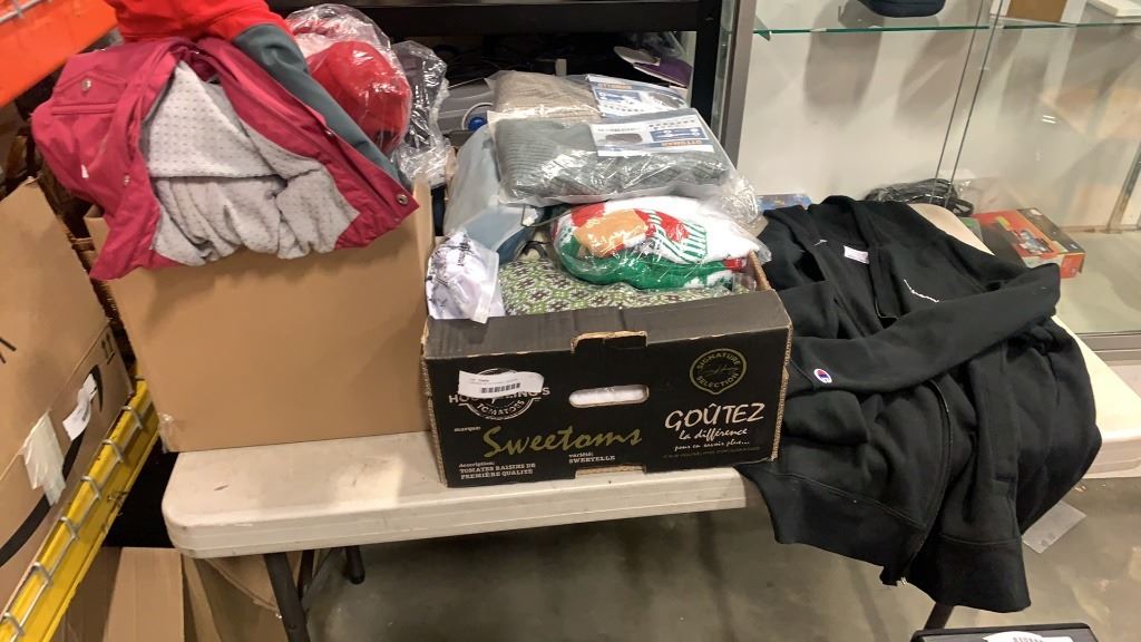 2 BOXES OF CLOTHING, JACKETS, OTTOMAN COVERS, ETC