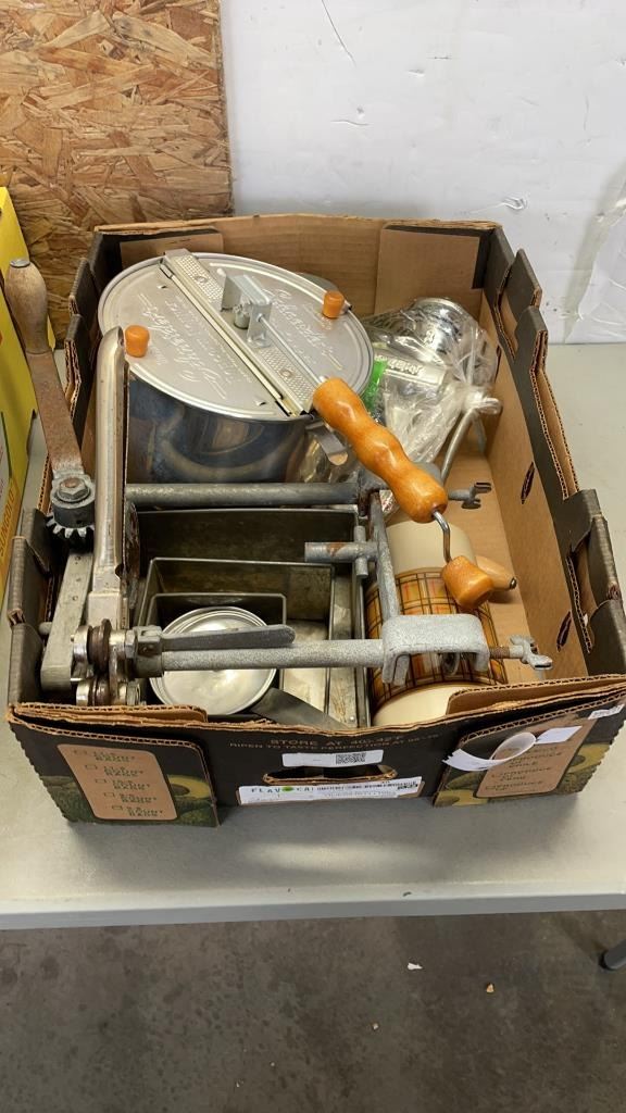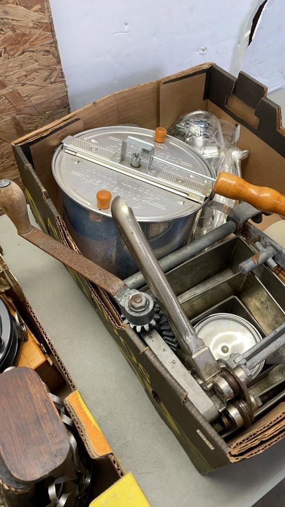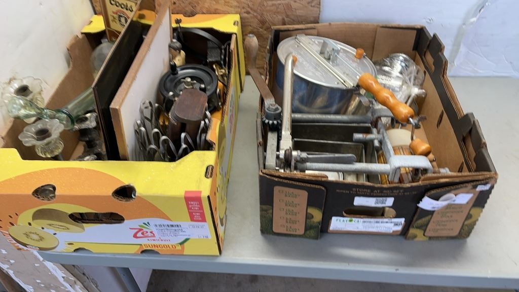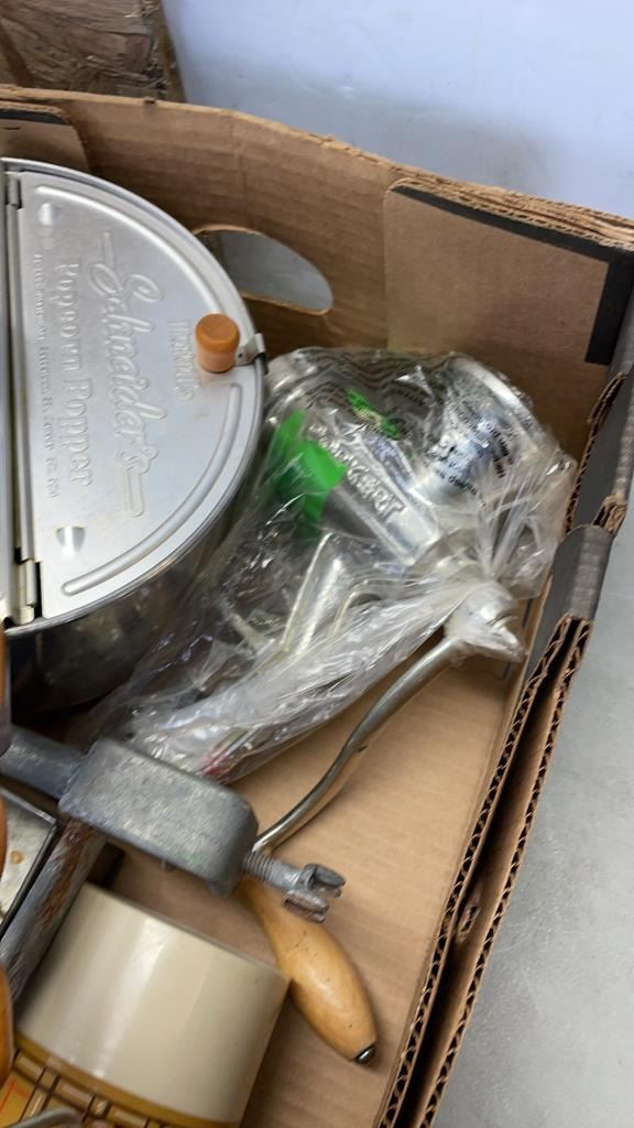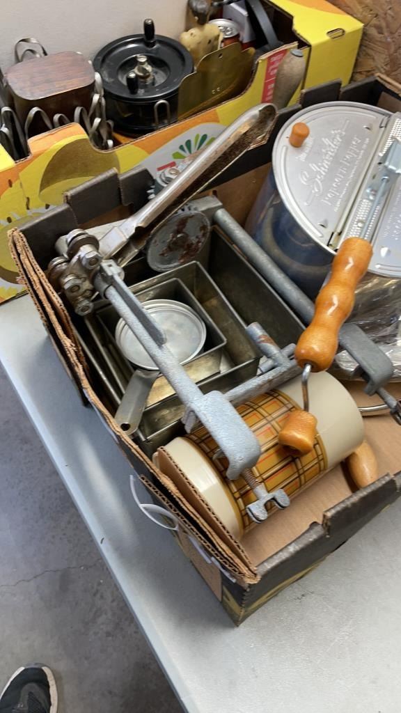 2 BOXES OF COLLECTIBLES, TIN SIGNS, KITCHEN ITEMS, CANNER, POPCORN POPPER, COORD BOTTLE OPENER, IRON