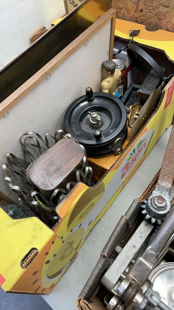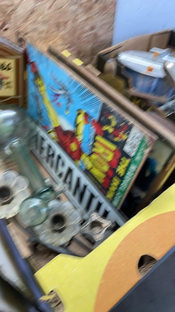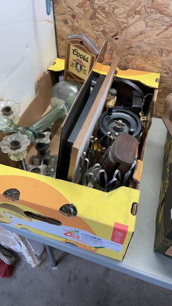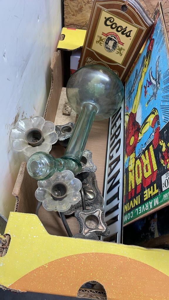2 BOXES OF COLLECTIBLES, TIN SIGNS, KITCHEN ITEMS, CANNER, POPCORN POPPER, COORD BOTTLE OPENER, IRON MAN SIGN