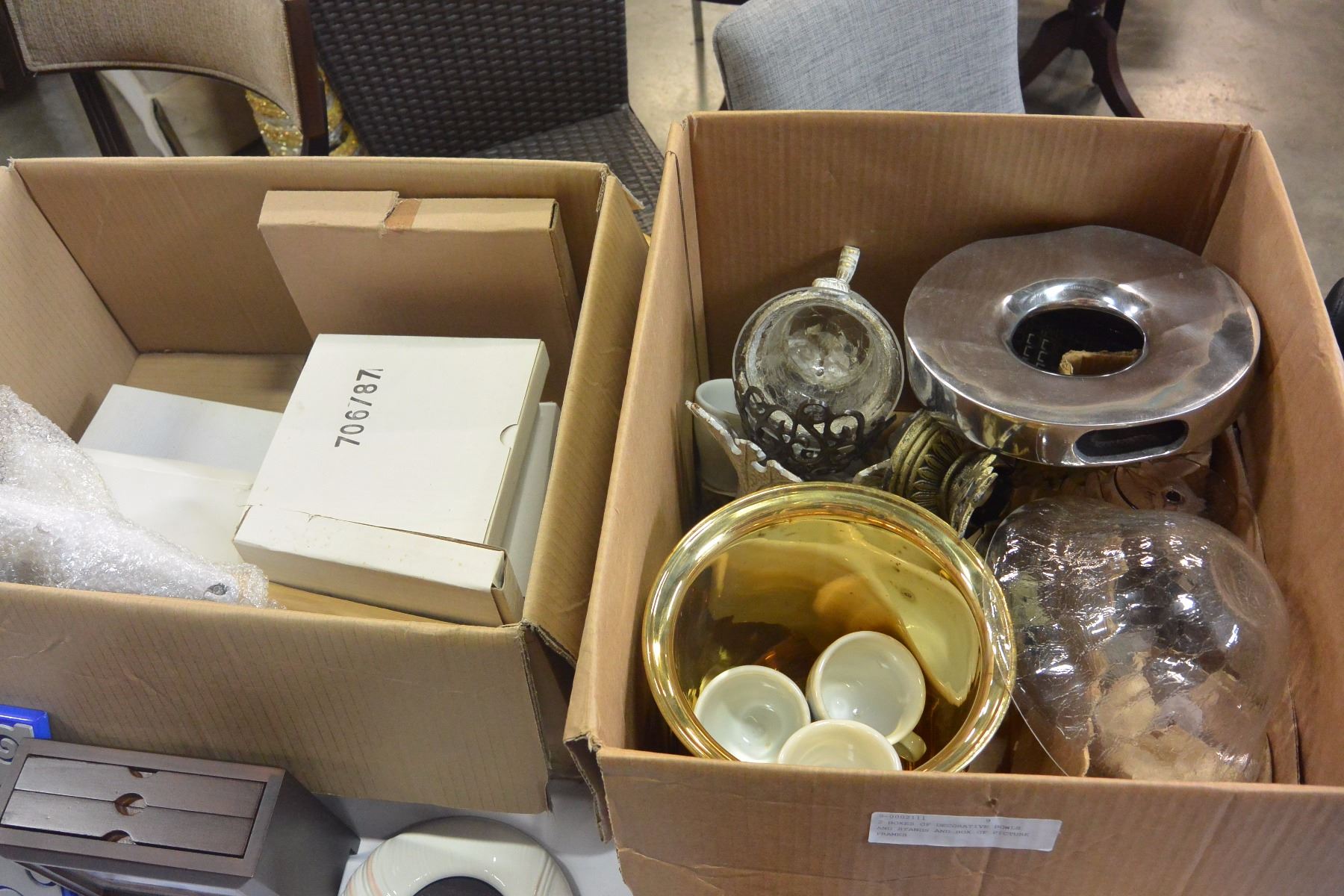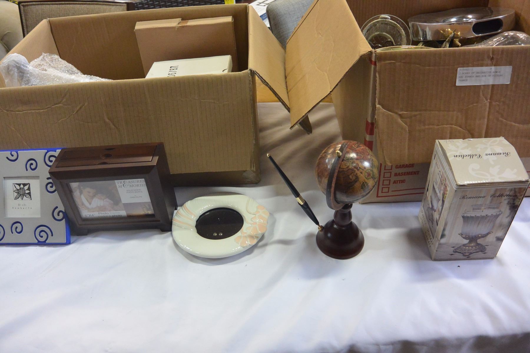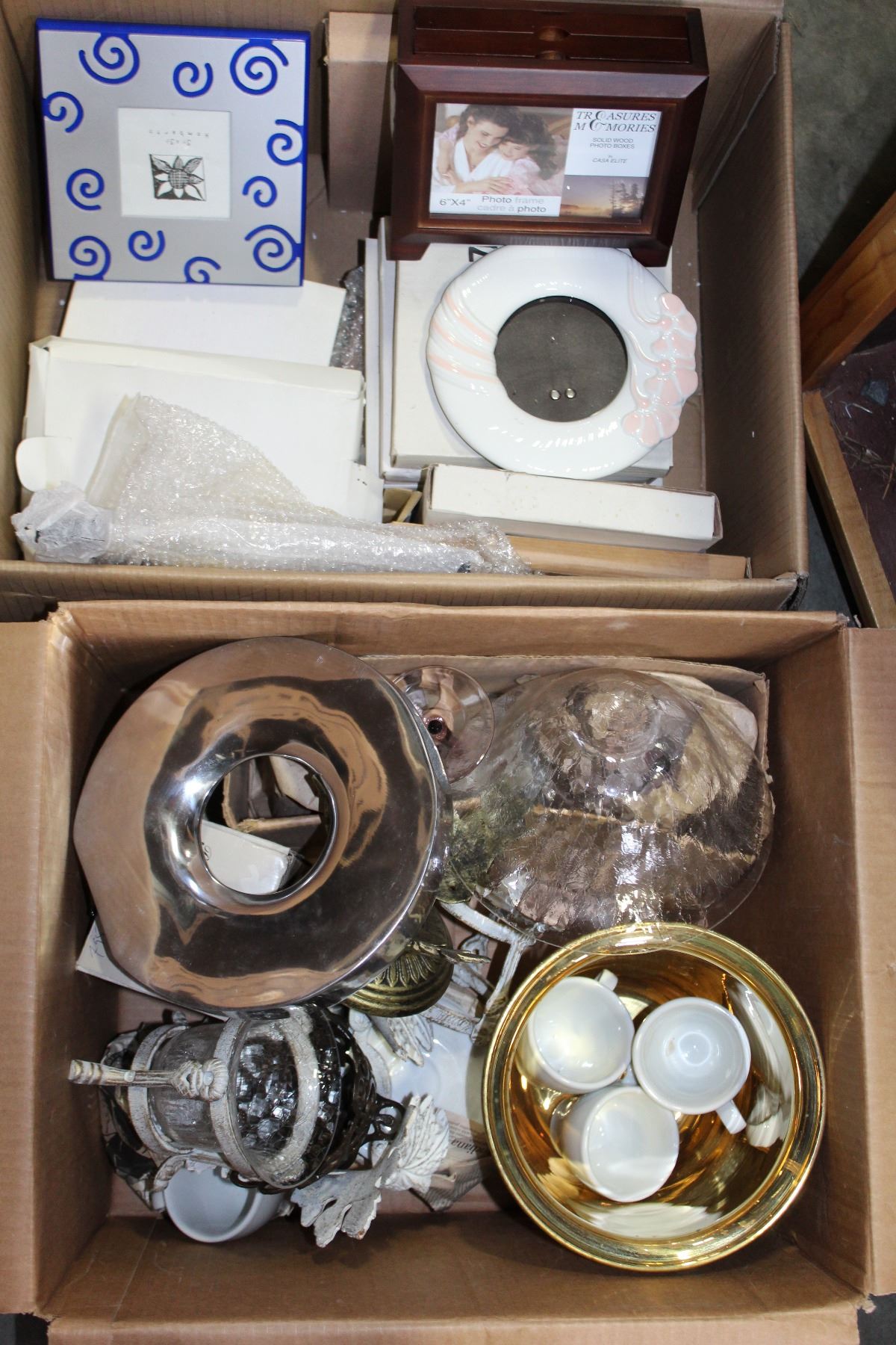 2 BOXES OF DECORATIVE BOWLS AND STANDS AND BOX OF PICTURE FRAMES