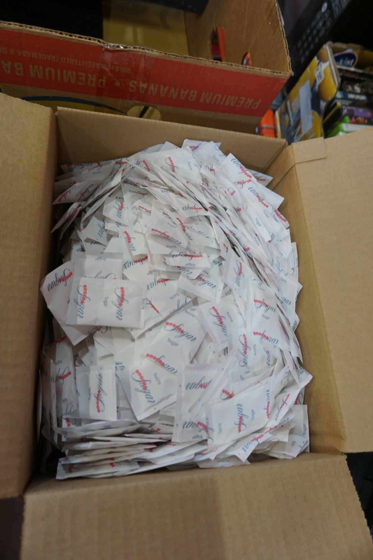 2 BOXES OF DIXIE PLASTIC SPOONS AND KNIVES AND BOX OF REAL SUGAR PACKETS AND MONITOR