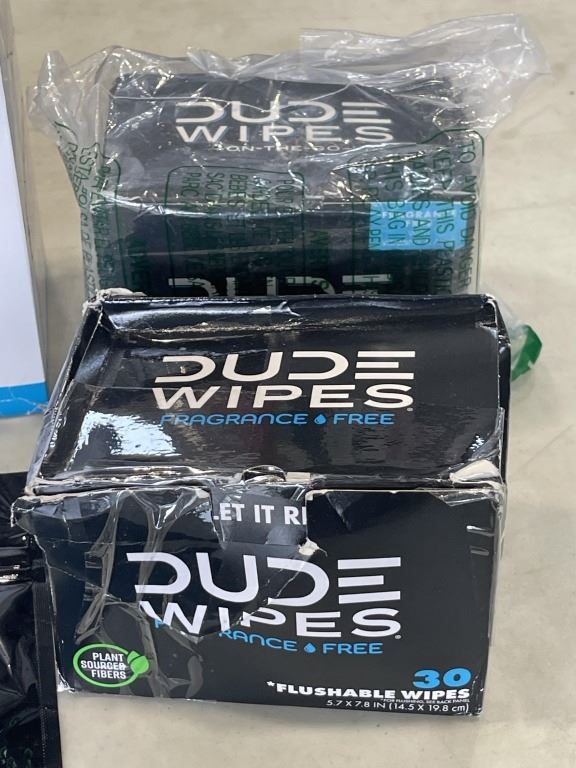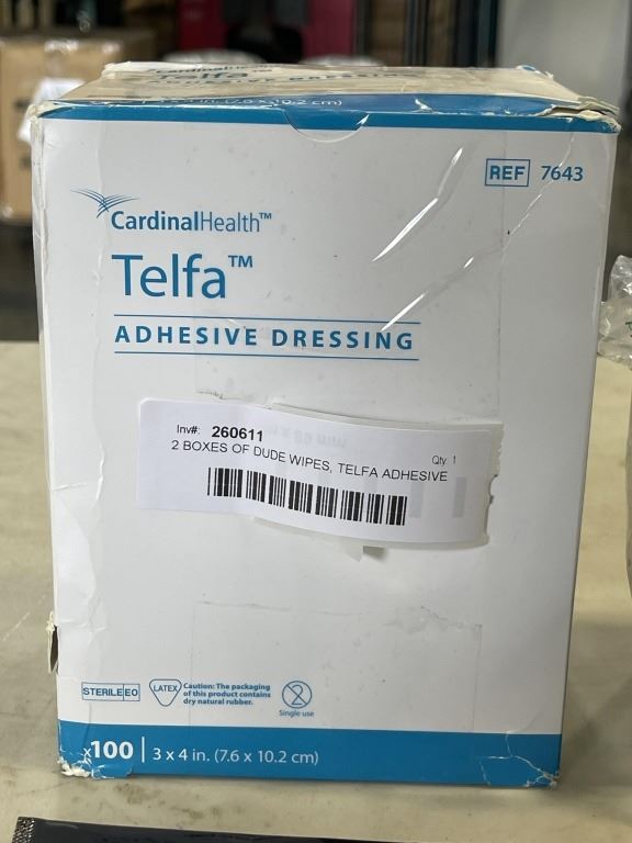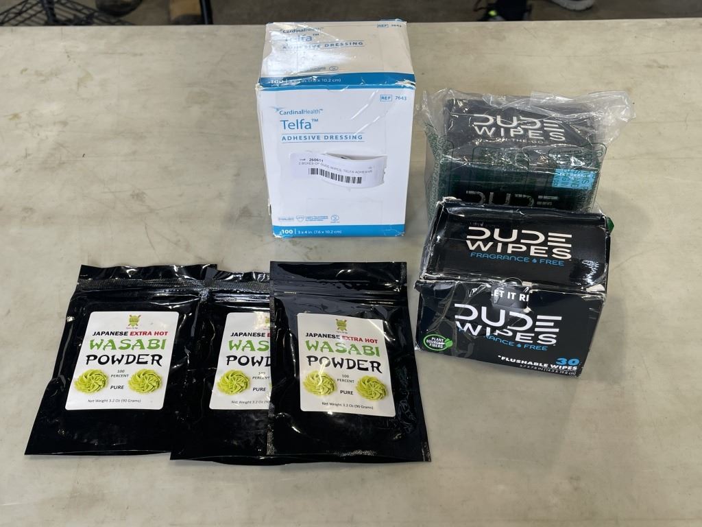 2 BOXES OF DUDE WIPES, TELFA ADHESIVE DRESSING AND WASABI