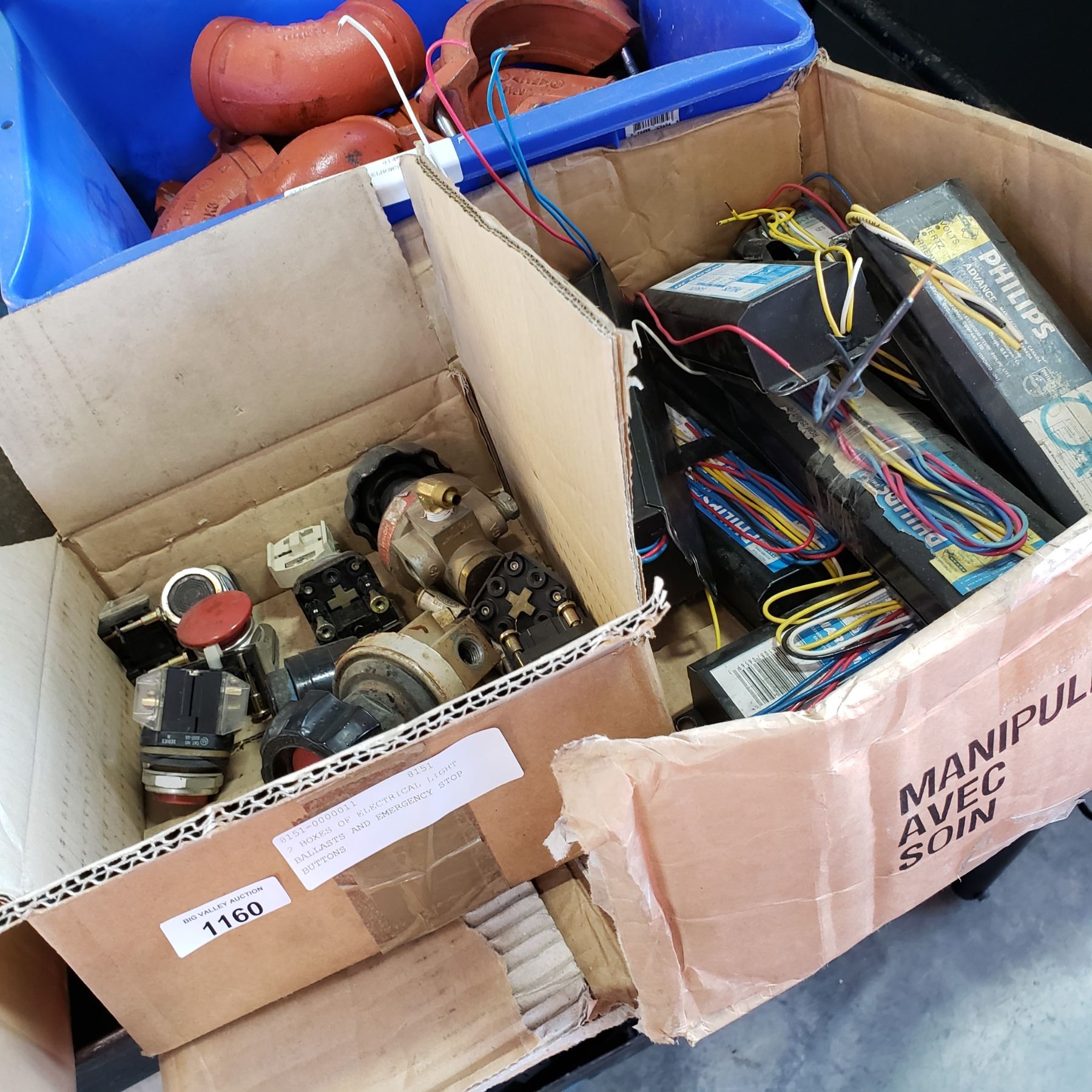 2 BOXES OF ELECTRICAL LIGHT BALLASTS AND EMERGENCY STOP BUTTONS