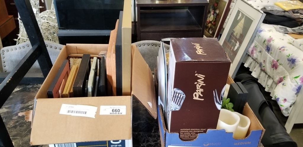 2 BOXES OF ESTATE COLLECTIBLES AND PICTURE FRAMES