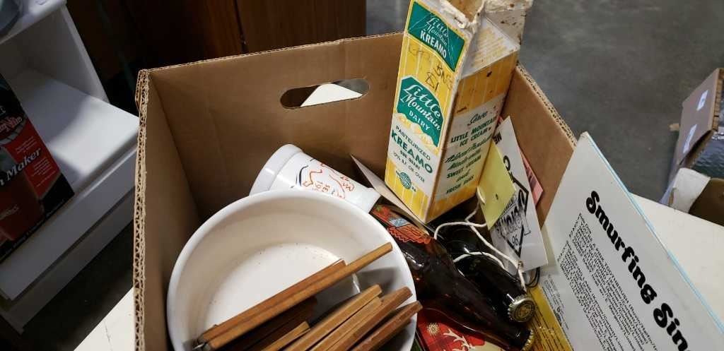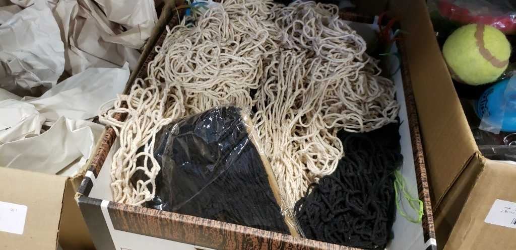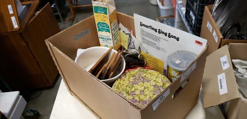 2 BOXES OF ESTATE GOODS, ANTIQUES, WOVEN NETTING