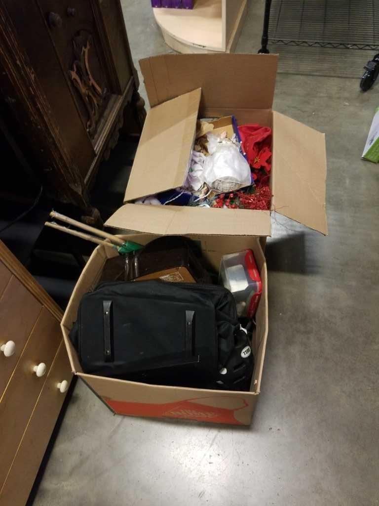 2 BOXES OF ESTATE GOODS, BOARD GAMES, CROSLEY REPRODUCTION RADIO, FISHING TACKLE, TOOLS