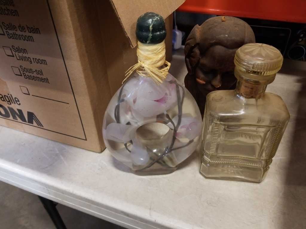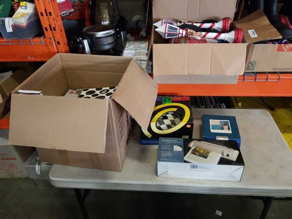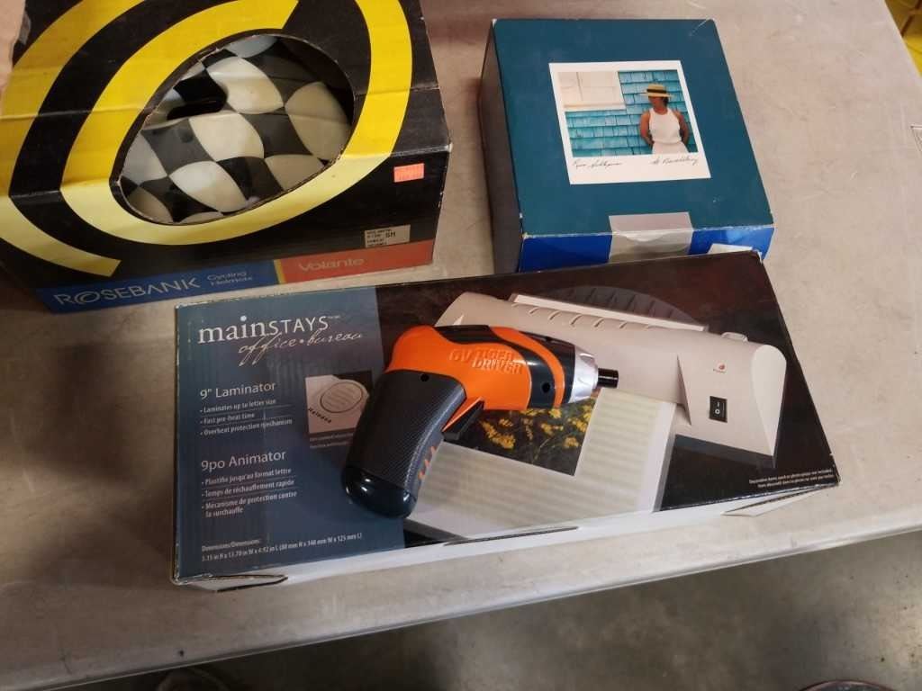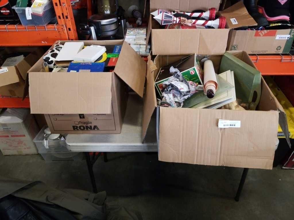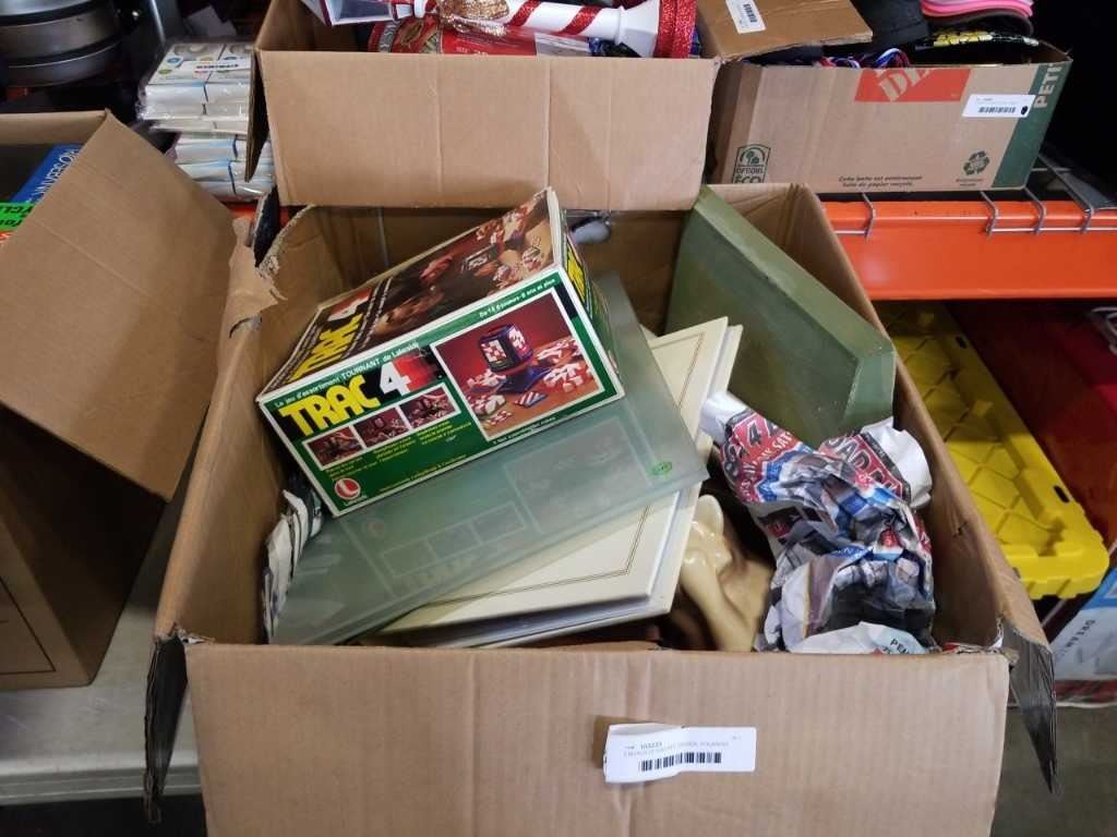 2 BOXES OF ESTATE GOODS, POLAROID CAMERA, BIKE HELMET, ETC