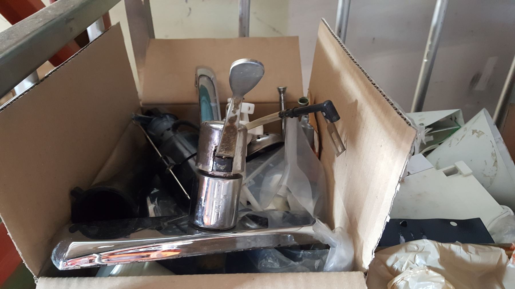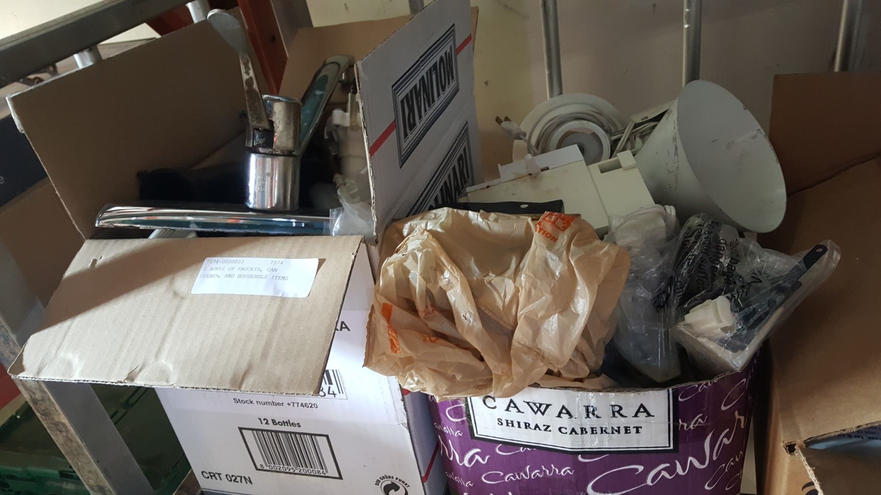 2 BOXES OF FAUCETS, CAN OPENER, AND HOUSEHOLD ITEMS