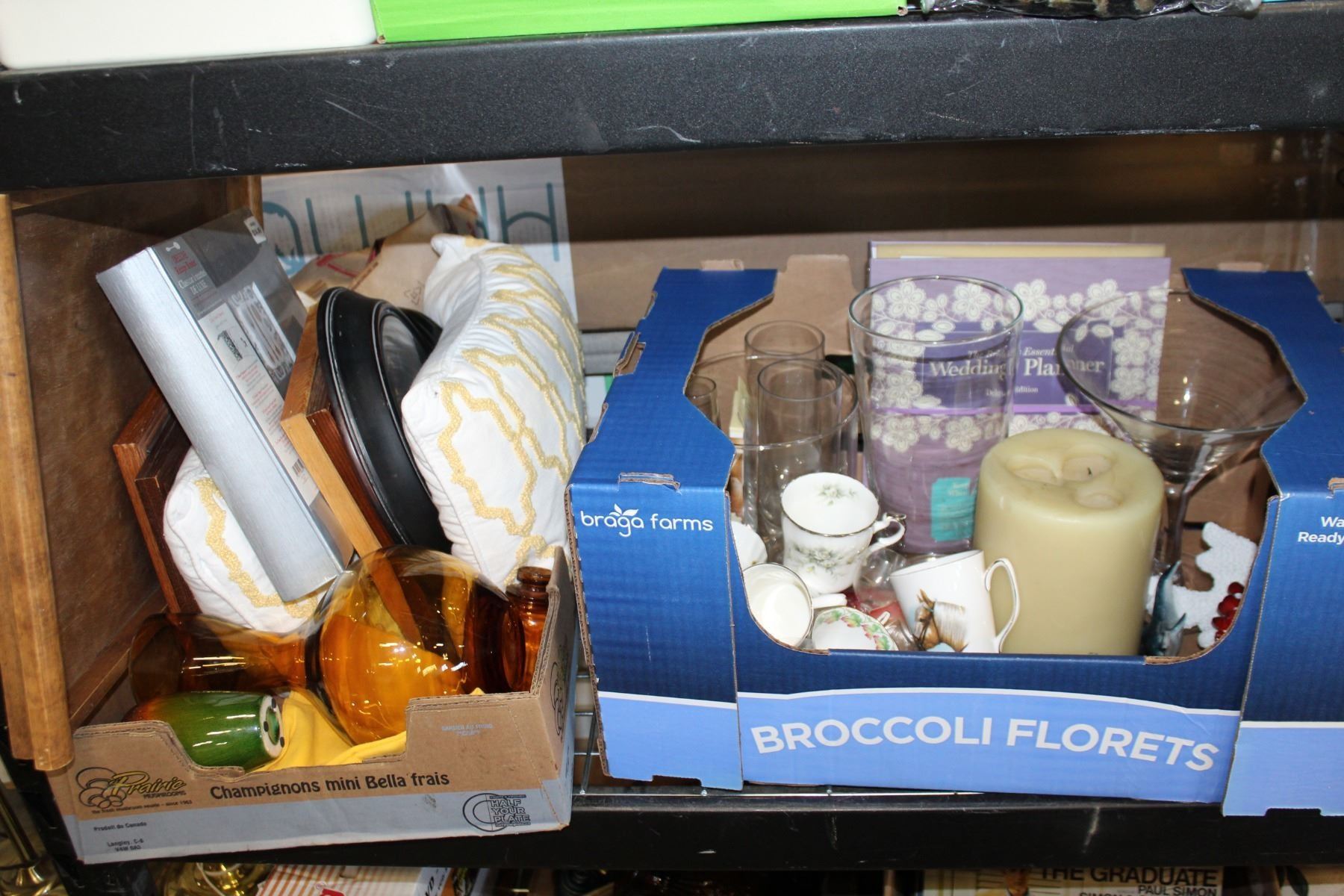 2 BOXES OF GLASSWARE, CLOCK, AND PILLOWS