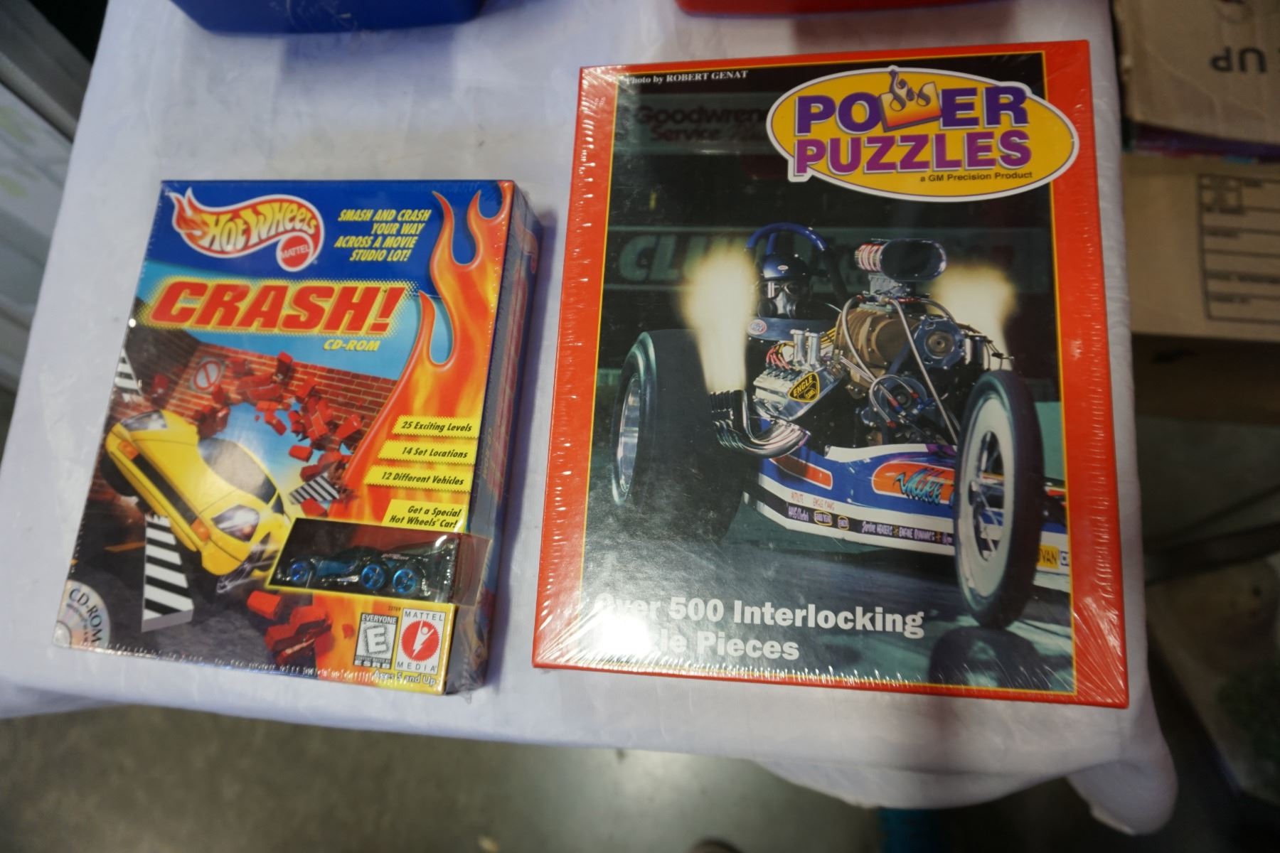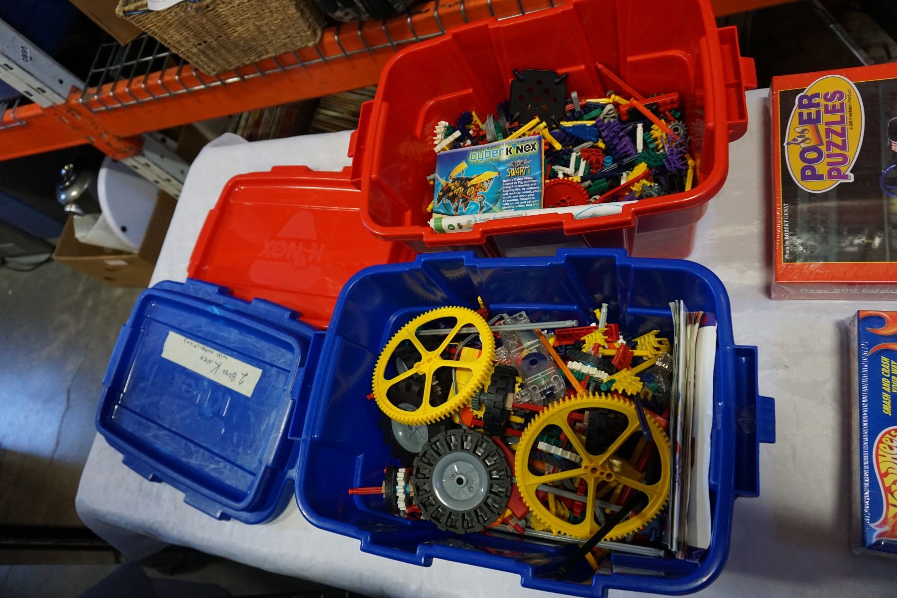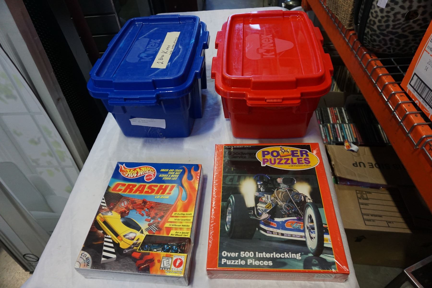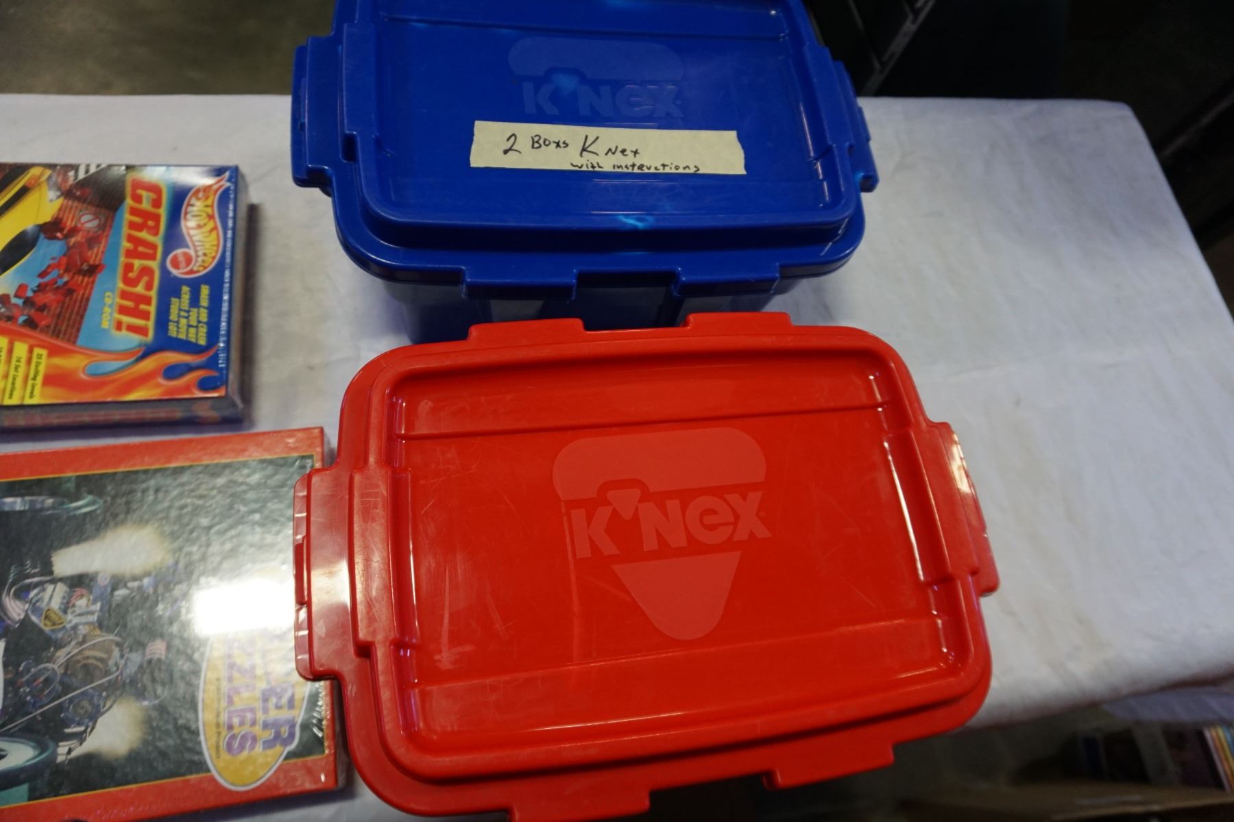 2 BOXES OF KNEX, HOTWHEELS, GAMES, AND PUZZLE