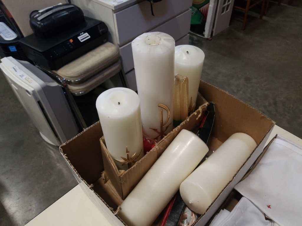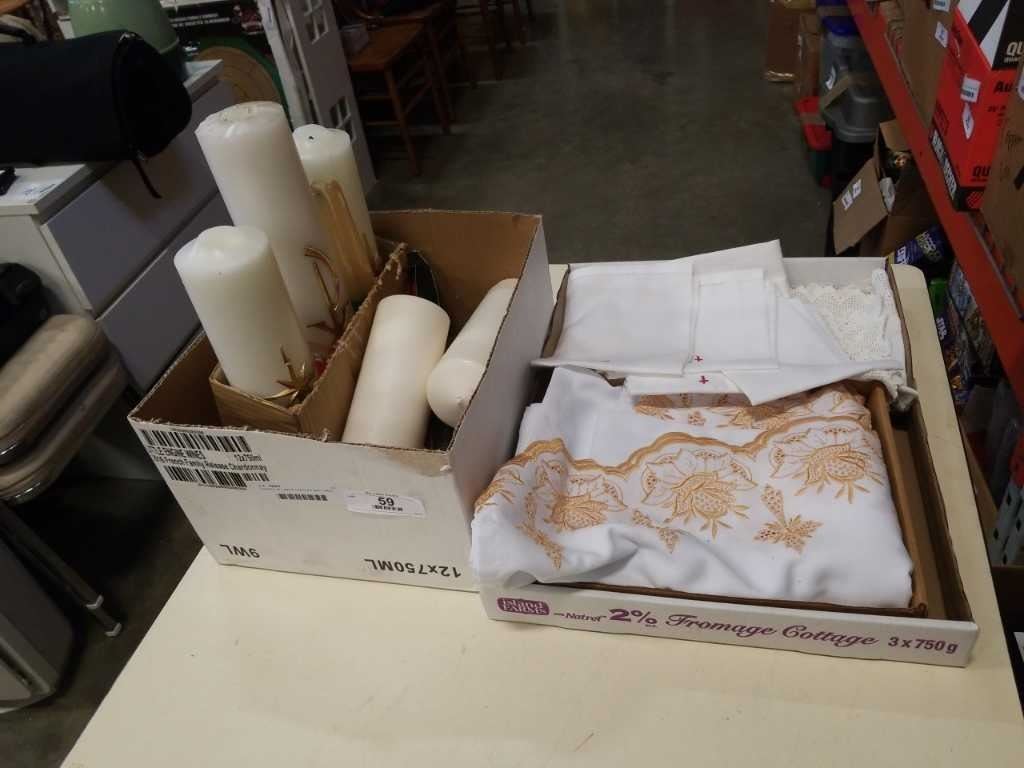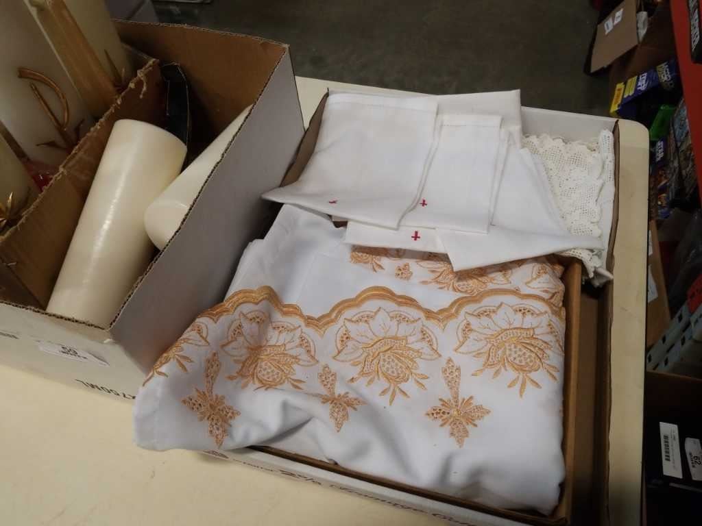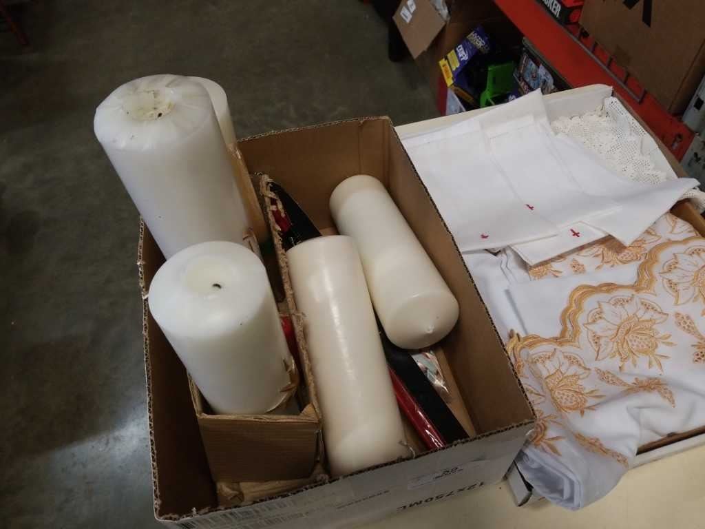 2 BOXES OF LARGE CANDLES AND TABLE COVERS