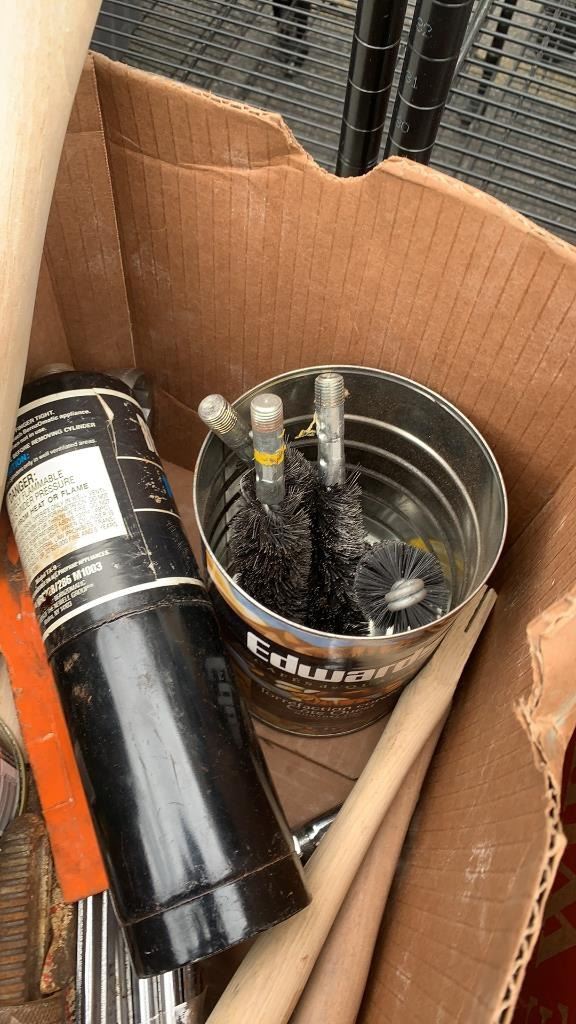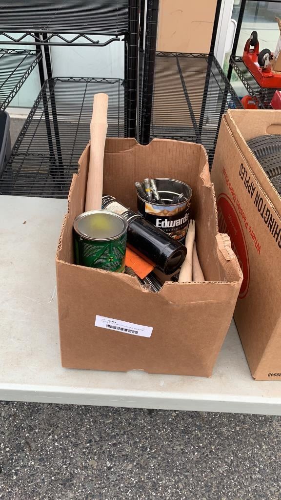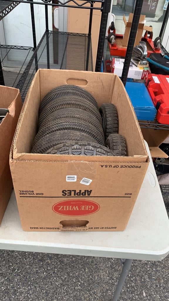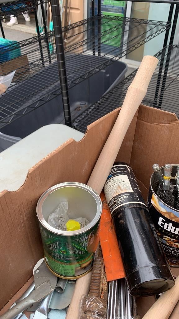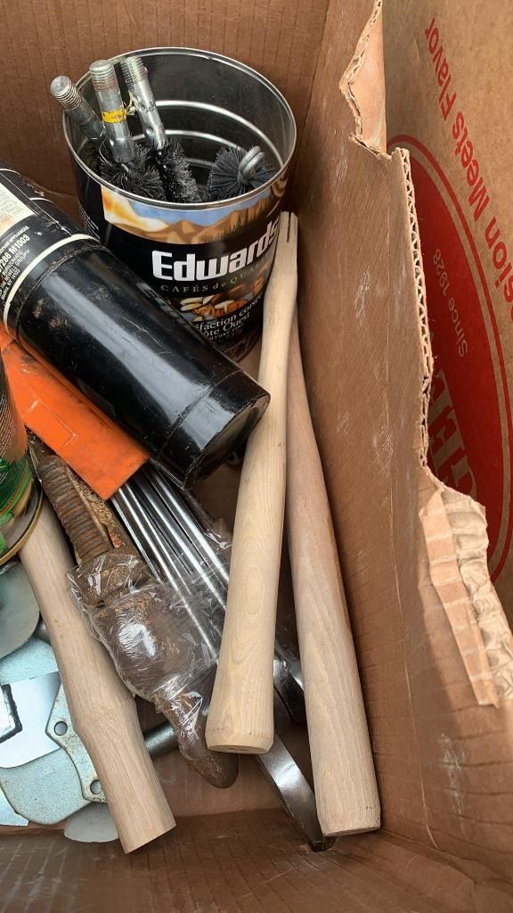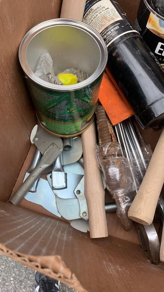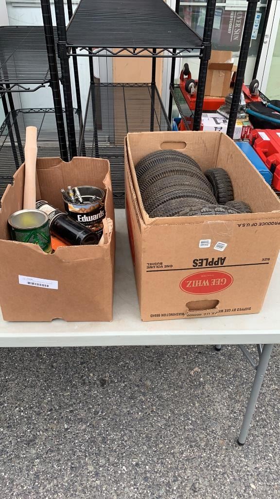 2 BOXES OF LARGE WRENCHES, PROPANE TORCH, DOLLY WHEELS AND MORE