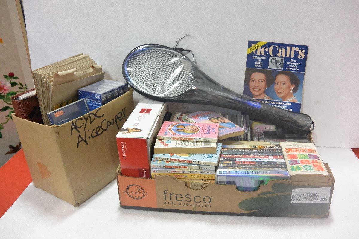 2 BOXES OF MOVIES, COLLECTIBLES & HOUSEHOLD
