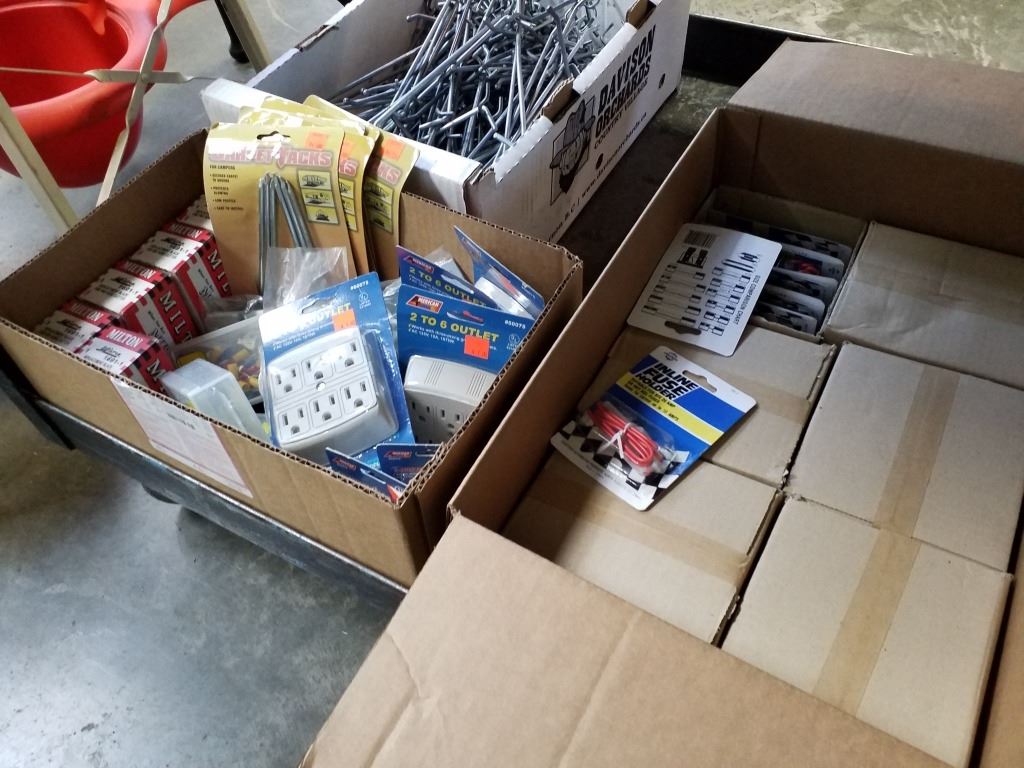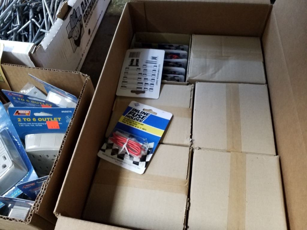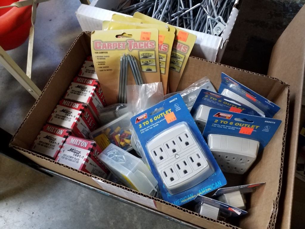 2 BOXES OF OUTLETS, LATCHES, SPIKES AND MORE