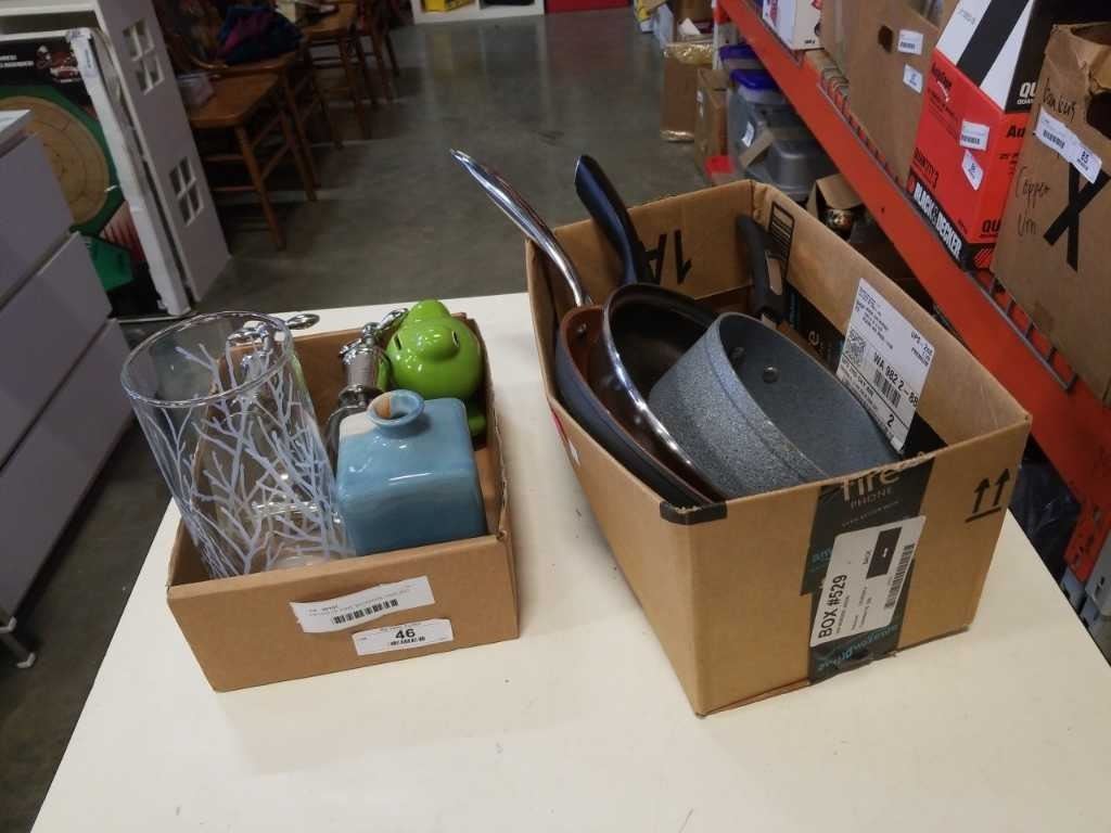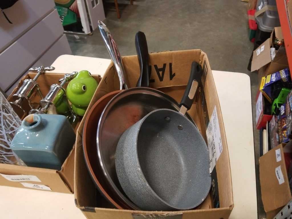 2 BOXES OF PANS, BOOKENDS, VASE AND FROG COIN BANK