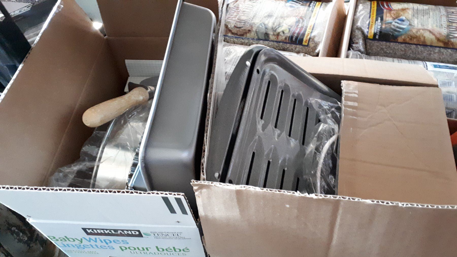 2 BOXES OF PANS, ROASTING PAN, AND BAKING TRAYS