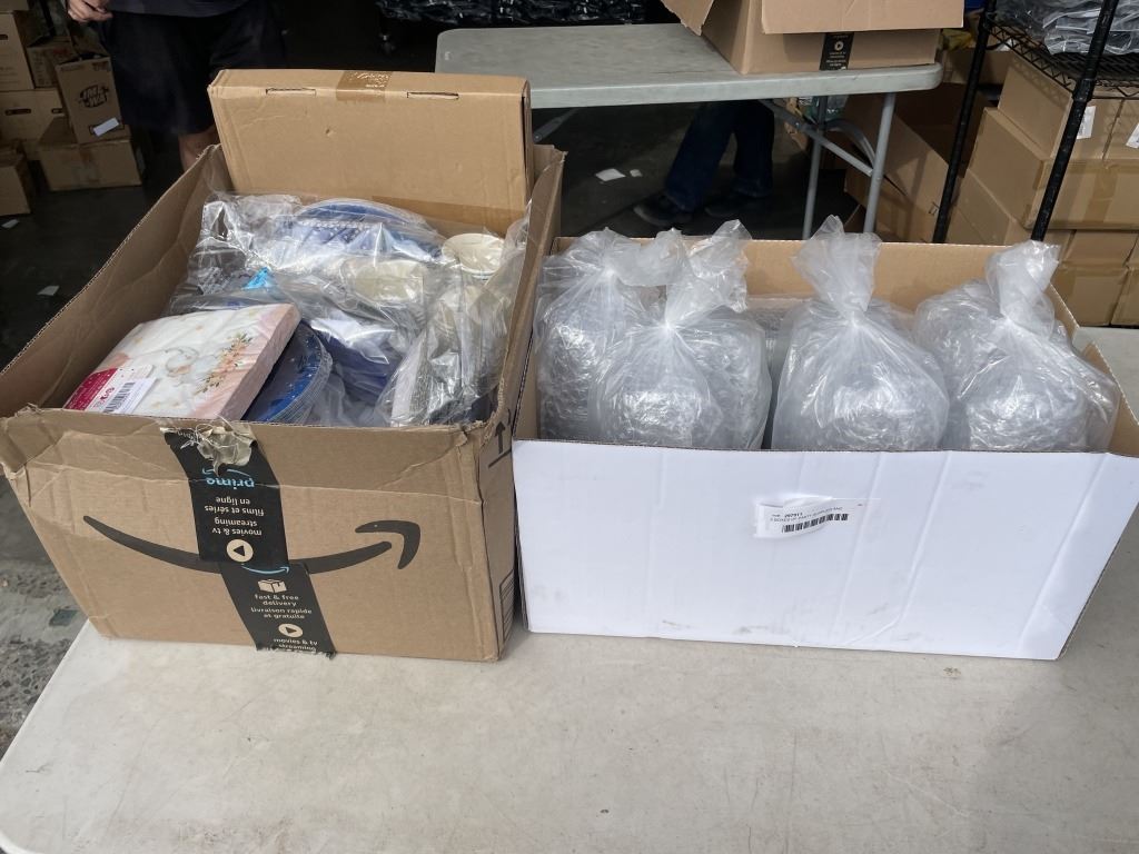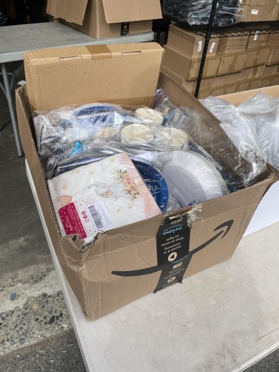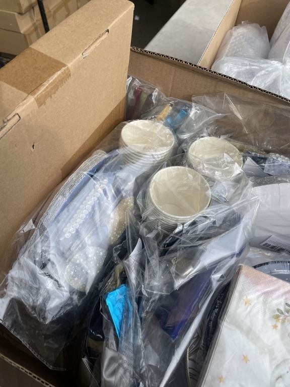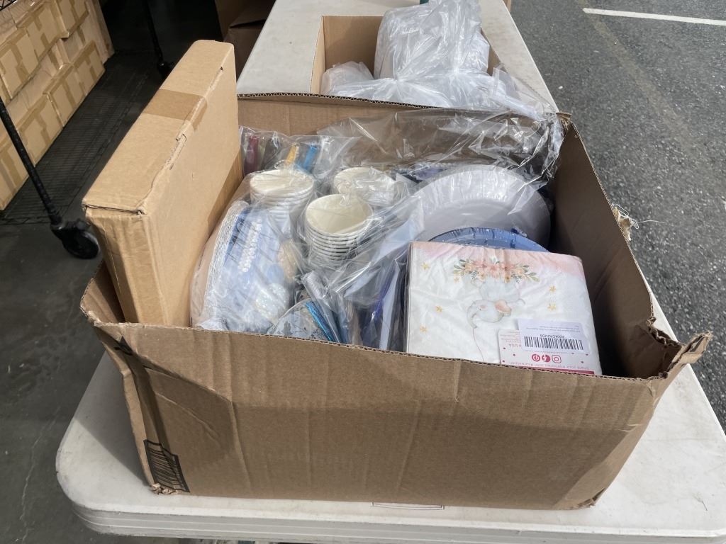 2 BOXES OF PARTY SUPPLIES AND DISPOSABLE PLATES AND DECOR, PLASTIC CUPS ETC