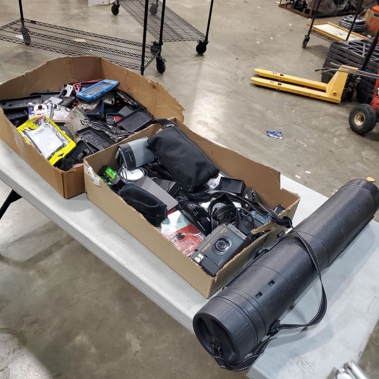 2 BOXES OF PHONE CASES, CAMERAS, ETC