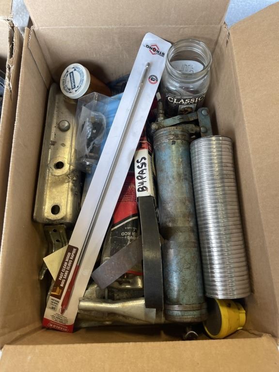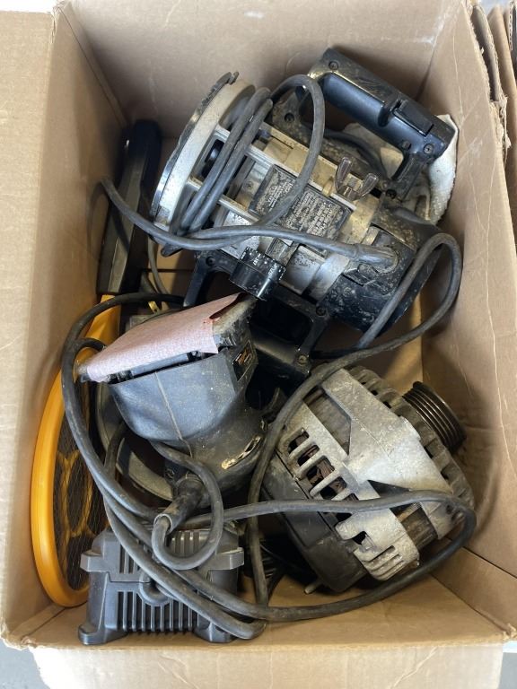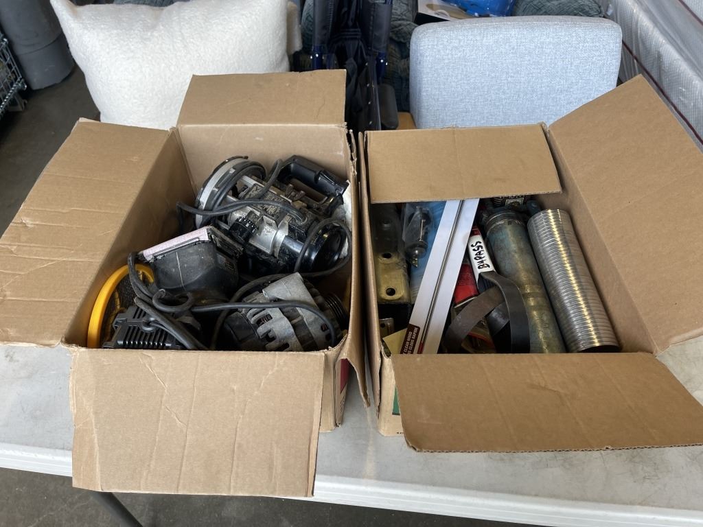 2 BOXES OF POWER TOOLS AND SHOP HARDWARE, ROUTER, SANDER ETC